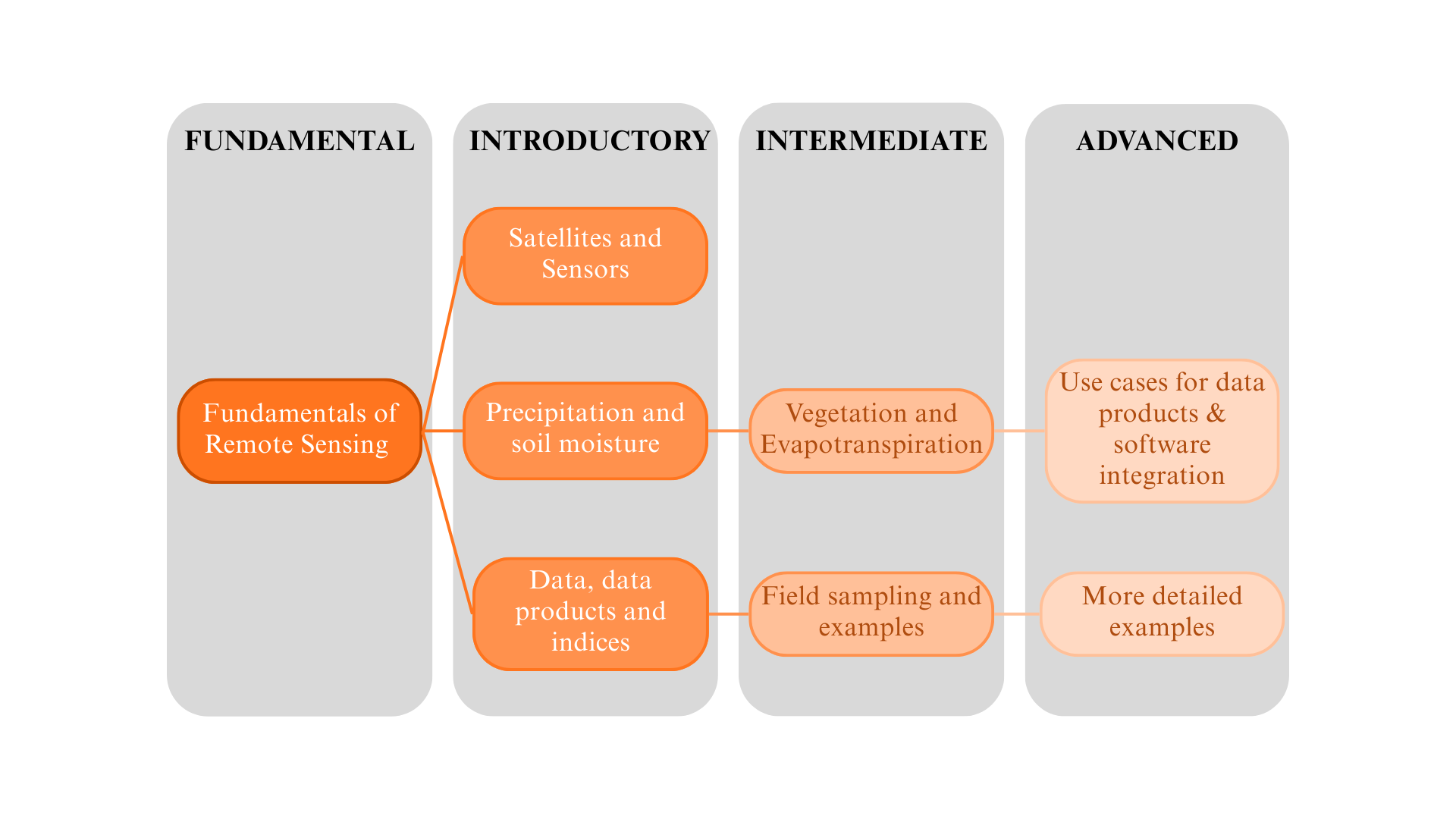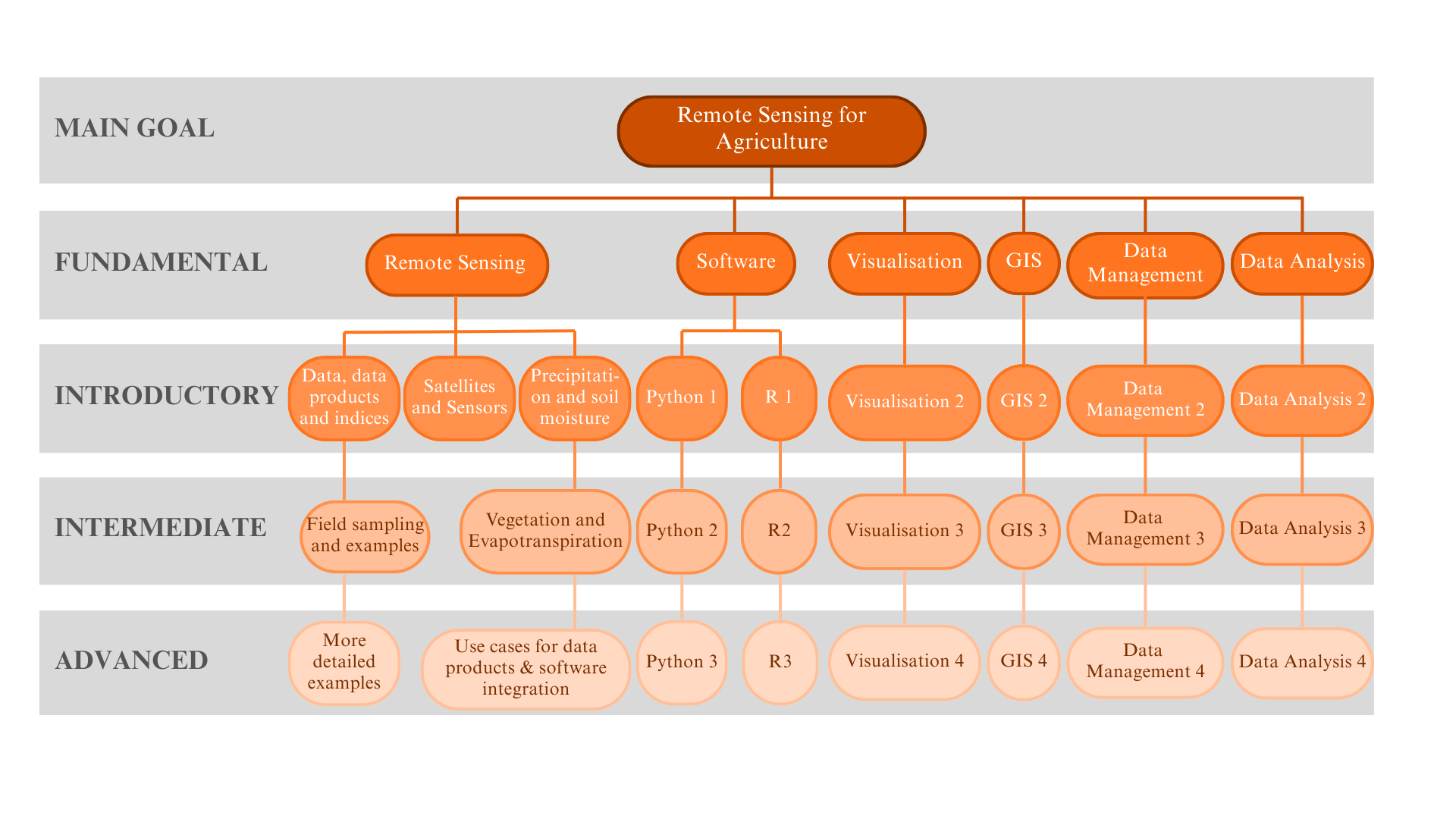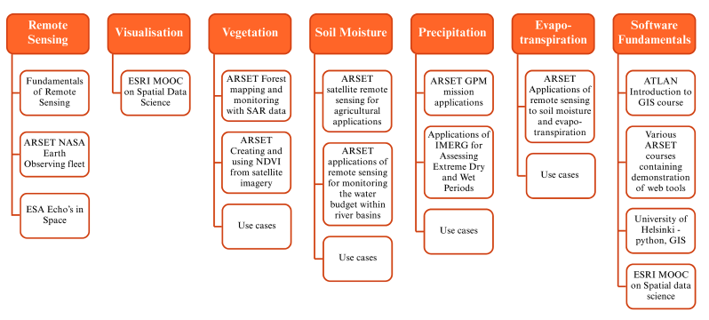 A related worthy project is the use of the Training Catalogue and the PLP to create expanded ‘spines’ of training programs. The spine is made up of the higher-level topics, or knowledge areas and shows how they break down into recommended courses. An example is shown in Figure 33.10 with the spine now comprising vegetation, soil moisture, precipitation and evapotranspiration, in addition to the existing Knowledge Areas of Remote Sensing, Visualisation and Software Fundamentals. An example of a potential corresponding Spine course is shown in Figure 33.11.