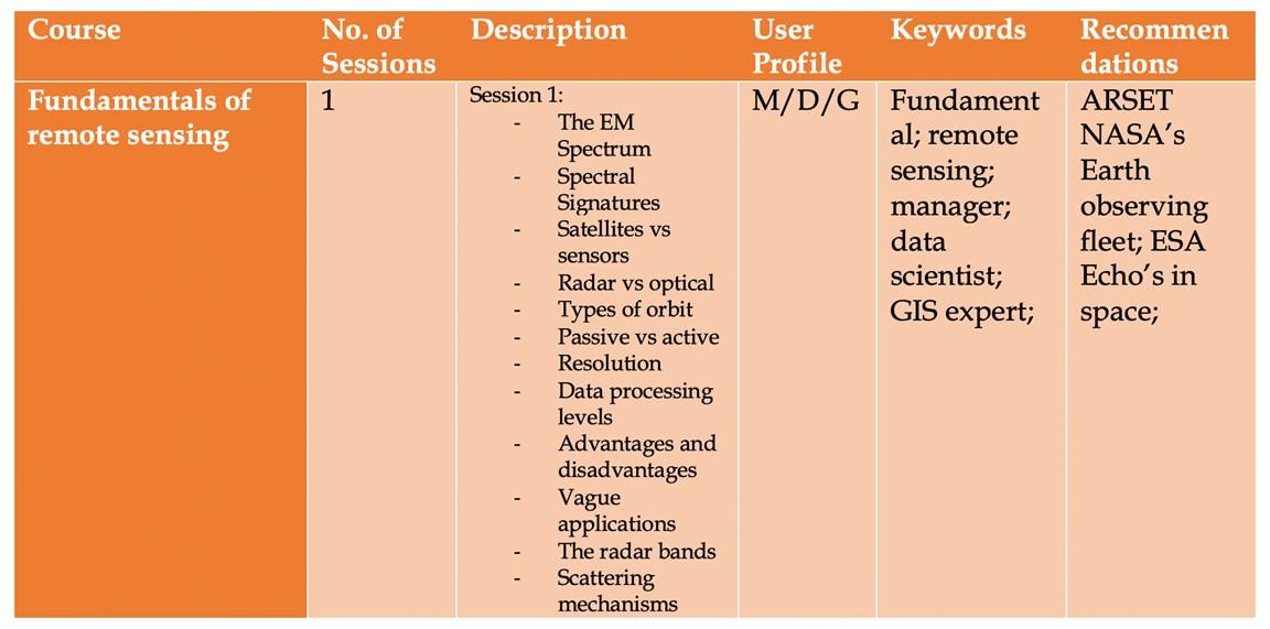 Although bespoke courses can be developed, many individuals and entities lack time, funding and skills to pursue this approach. Hence it is beneficial to take advantage of the many courses on aspects of earth observation data that are available online. However, the plethora of courses is both a blessing and a curse. These courses range from easy to advanced, conceptual to technical, and vary greatly by time to completion and workload. They also range across topics, covering issues such as access, management, analysis and interpretation. Moreover, the courses are offered by a very wide range of providers with diverse reputations and range widely in fee structures. As a result, an individual or organization seeking to make use of this wealth of potential online training can spend an enormous amount of time sifting through the options to identify courses that most suit their needs and expectations.