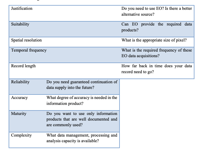 Chapter 2- Data sources (lead authors Dr Arnold Dekker, Dr Alex Held and Ms Flora Kerblat from CSIRO, Australia). This chapter introduces types of earth observation systems (low, medium and geostationary) and provides a detailed overview of freely available satellite sensor data current as at 2017. It describes categories of methods for analysing these data (empirical, semi-empirical, physics-based, object based image analysis (OBIA) methods and artificial intelligence (AI) and machine learning methods. It includes case study examples, such as the Geoscience Australia data cube, which provided proof of concept for additional CEOS datacubes, and examples of United Nations Sustainable Development Goals (SDGs) that can be monitored using earth observation data. This chapter distinguishes between unprocessed earth observation data and analysis ready data and discusses validity of different data and assessing whether it is fit for purpose. Importantly, the chapter provides mapping between statistician and earth observations scientist definitions of: Relevance, Timeliness, Accuracy, Coherence, Interpretability, and Accessibility, and add two additional definitions from the EO discipline; integrity and utility for assessing EO data quality for use in official statistics1(Table 2).