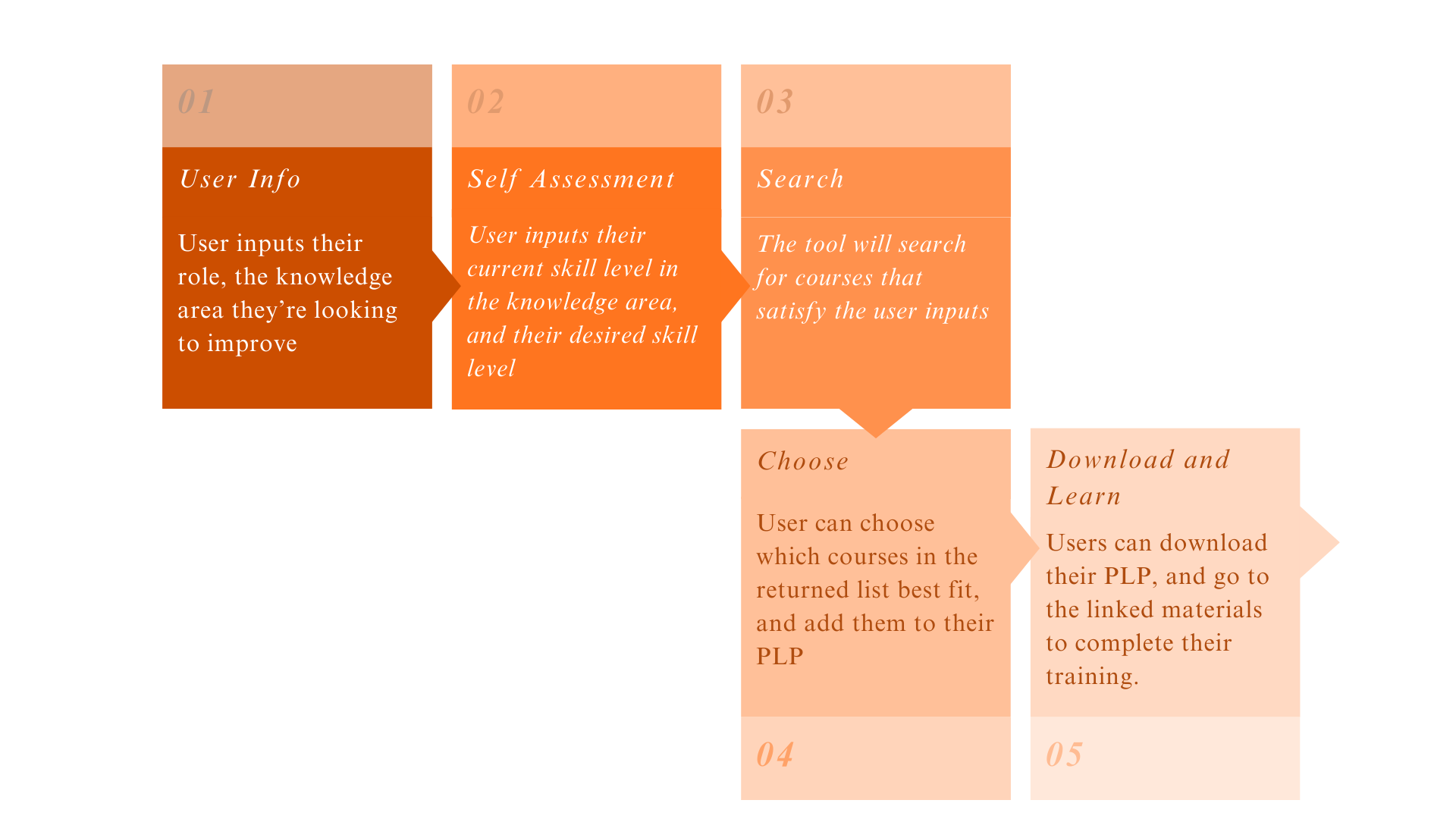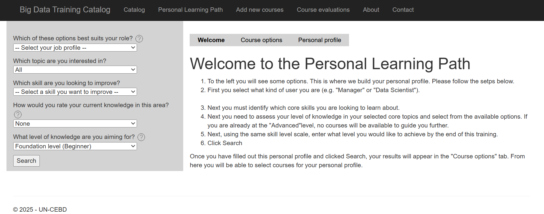 The PLP is underpinned by a searchable catalogue that comprises metadata on a large suite of courses identified as relevant to the five knowledge areas. This list was obtained through extensive manual searches at the time of development. Users are invited to update and expand the courses listed in the catalogue and provide feedback on the merit of any courses undertaken.