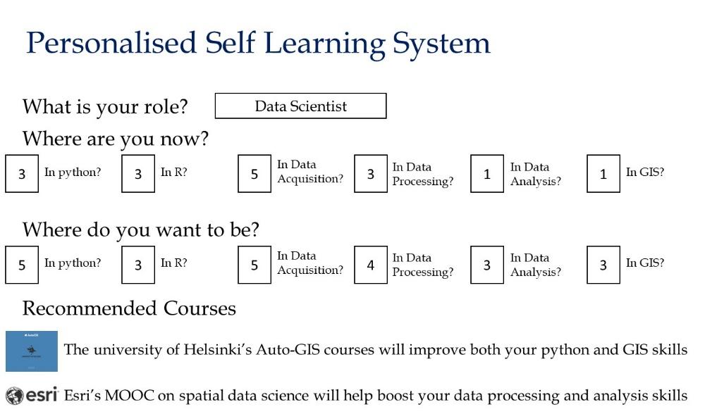 The appeal of the PLP is the ability to quickly identify trusted courses that bridge the gap between a user’s current and desired skill levels in key knowledge areas. The courses recommended by the PLP are tailored to the type of user (manager, data scientist, GIS expert).