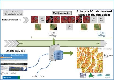 The Sen2Agri toolbox developed by Pierre Defourny, Sophie Bontemps and their team at UC Louvain is a user-friendly software that allows for automatic acquisition and preprocessing of EO data, manual upload of in-situ data, and production of crop maps using a Random Forest classifier. It can run both locally and on the Cloud. A cameo of the Sen2Agri process is shown in Figure 33.8.