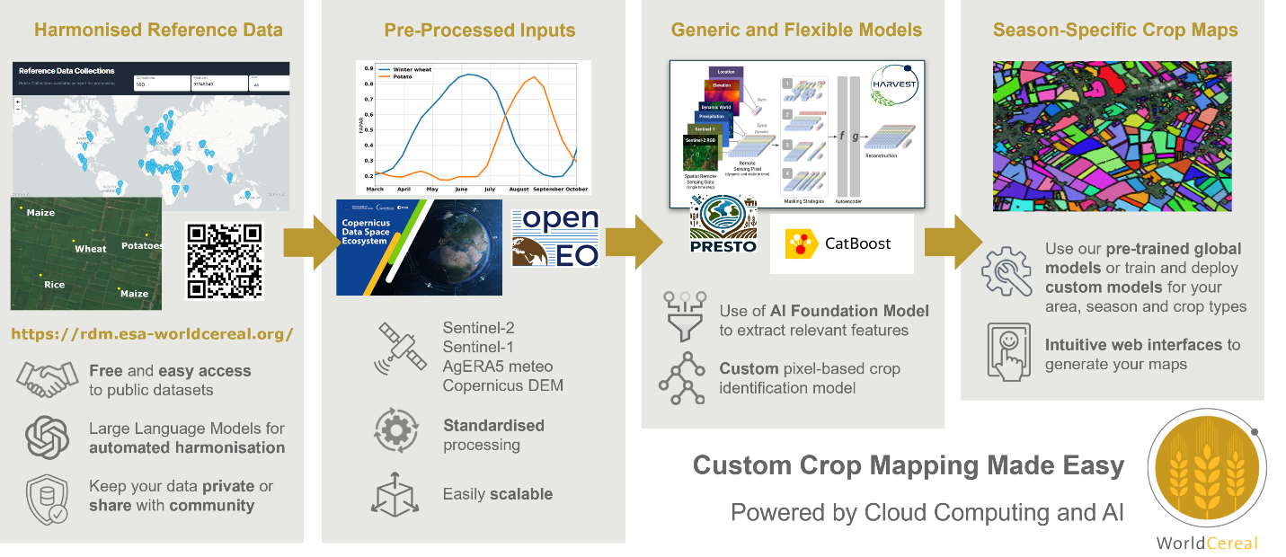 The WorldCereal project, funded by the European Space Agency, was launched in 2020 to overcome these barriers. Its ambition is to create an open, scalable, and reproducible local-to-global crop mapping system (Figure 32.1). It rests on two pillars. The first is harmonised reference data, managed through the WorldCereal Reference Data Module (RDM). The second is a transferable classification system that converts satellite time series into crop maps. The first version (v1, 2023) used expert-defined features and machine learning to produce the world’s first global seasonal crop maps at 10 m resolution for 2021 [3]. The second version (v2) replaces expert features with machine-learned features, so-called embeddings, using a geospatial foundation model, improving transferability across regions and seasons [4]. In addition, WorldCereal is designed with usability in mind. A web-based Processing Hub lets users generate their own maps by selecting a region and season of interest, without coding. Users can also add their own - private - reference data to further tailor outputs to their specific needs. By doing so, users can benefit from globally learned crop-specific representations of satellite data and finetune it to their local needs with their own data.