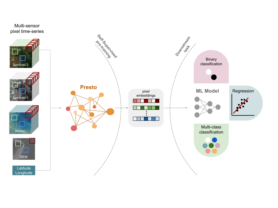 During development, several foundation models were evaluated that had been released at that time (e.g. SatMAE, CROMA, ScaleMAE, Presto), and Presto was selected for its efficiency, open-source availability, and compatibility with the WorldCereal processing architecture, aligning well with our requirements listed in Section Section 32.3.1. Presto, developed by NASA Harvest, is a lightweight transformer-based feature extractor pre-trained on global Sentinel-1/2 time series enriched with topography and meteorology (Figure 32.4). It learns generalizable patterns without requiring labels, and its embeddings can be fine-tuned with relatively few reference samples, significantly improving robustness where data are scarce.