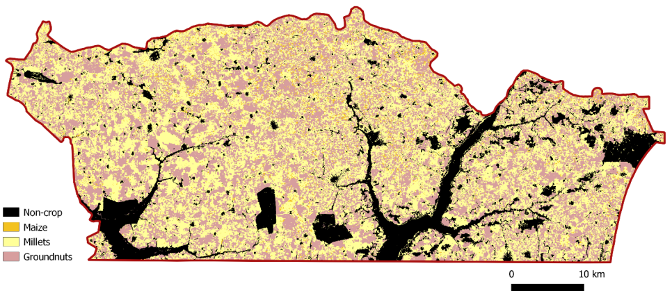 To generate the crop-type map for the Nioro region, a random forest classifier was applied (see chapter 17 for full details) identifying four primary crop classes: maize, millet, groundnut, and other crops. Pixels not associated with these four classes were classified into a non-agricultural land-use category and excluded from crop-specific analysis (Figure 25.1).