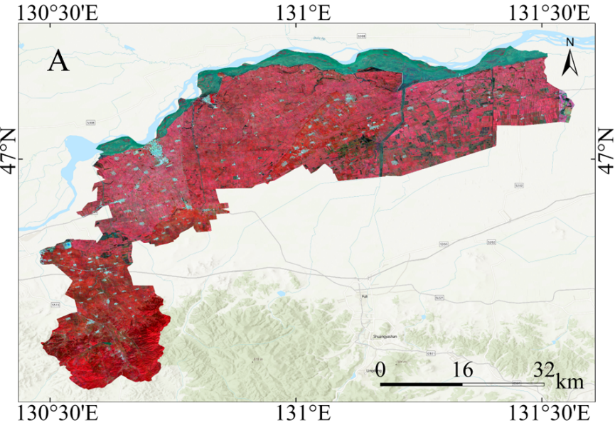 PRICOS was validated in two experimental areas, as shown in Figure 15.1 and Figure 15.2. Site A is Huachuan County, Jiamusi City, Heilongjiang Province, China (130°16′–131°34′E, 46°37′–47°14′N), with an area of approximately 2,268 km². It is a typical single-cropping rice area in Northeast China. The terrain is flat, and the region has a temperate continental monsoon climate, with an average annual temperature of about 3.5 °C and annual precipitation of around 550 mm. A single-cropping rice system is practiced, with transplanting usually in mid-May and harvesting in early October.