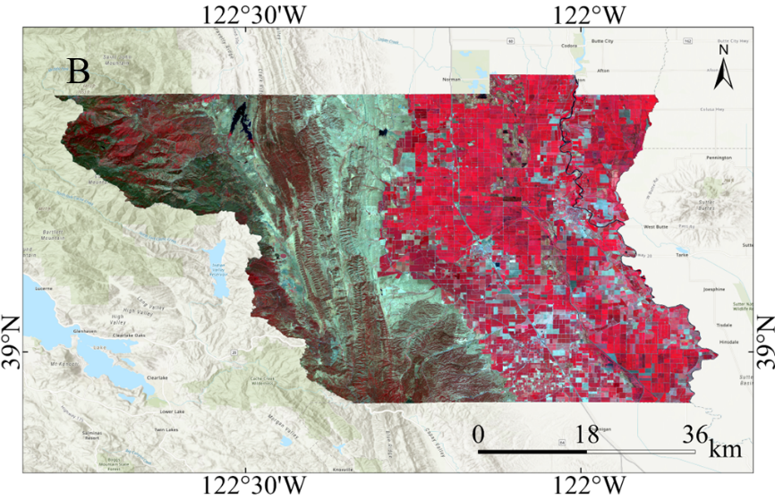 The code is also available in Google Earth Engine (GEE). Due to GEE memory limitations, only part of Colusa County is shown.