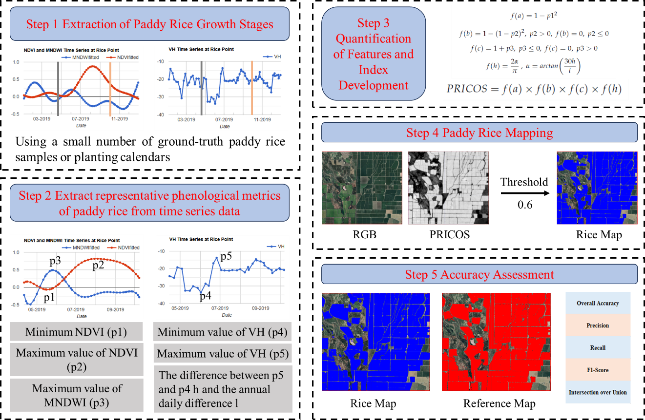 This section introduces a paddy rice identification index that combines optical and Synthetic Aperture Radar (SAR) features—PRICOS (Paddy Rice Index Combining Optical and SAR features) [4], which integrates optical data with Synthetic Aperture Radar (SAR) observations. By combining these data sources, PRICOS reduces common challenges in remote sensing, such as cloud cover and speckle noise, thereby improving classification reliability. Using time-series data from Sentinel-1 and Sentinel-2, the method identifies key rice phenological stages and can perform effectively even in areas with limited ground samples. PRICOS enhances the timeliness, spatial resolution, and reliability of rice statistics, providing support for agricultural planning and policy development.