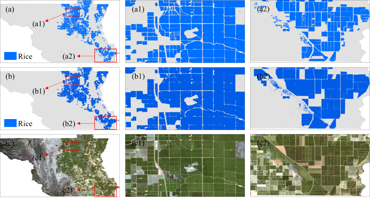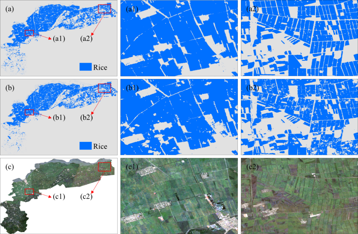 Figure 15.4 and Figure 15.5 present the paddy rice distribution maps for Sites A and B extracted using a 0.6 threshold. Compared with the reference maps and satellite imagery, PRICOS demonstrated high reliability in both regions. At the field scale, Site A showed particularly accurate delineation. Although some paddy rice pixels were missed in Site B, the high spatial resolution of the satellite imagery allowed for relatively precise depiction of field boundaries. Specifically, in Site A, PRICOS successfully reconstructed complete rectangular paddy rice fields with clear boundaries, as shown in Figure 15.4 (a1) and (a2), consistent with field features visible in satellite imagery (Figure 15.4 (c1) and (c2)). In contrast, the TWDTW-derived reference map exhibited patchy “gaps” and isolated small areas, with some actual rice fields omitted (Figure 15.4 (b1) and (b2) [5]. In Site B, PRICOS captured field boundaries more accurately in the northern zoomed-in area as shown Figure 15.5 (a1) and (a2), as confirmed by both satellite imagery, as per Figure 15.5 (c1) and (c2), and the CDL reference map, shown in Figure 15.5 (b1) and (b2). In the southern zoomed-in area (Figure 15.5 (a2)), some paddy rice pixels were still missed, indicating minor under-detection in that region.