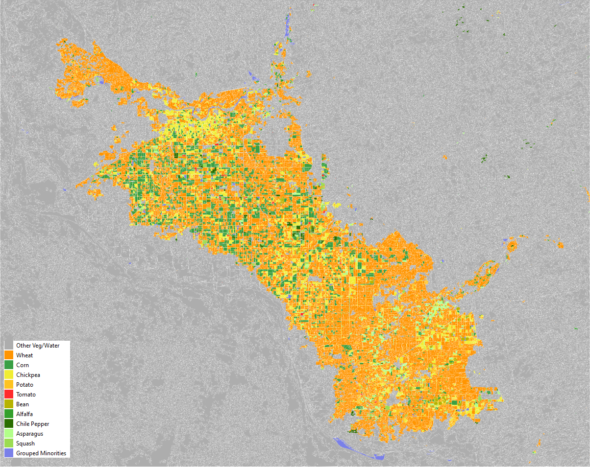 Finally, the trained model can be applied to all delineated parcels in the study area to produce the final crop classification map for the 2017-2018 agricultural season (an example is shown in Figure 13.2).