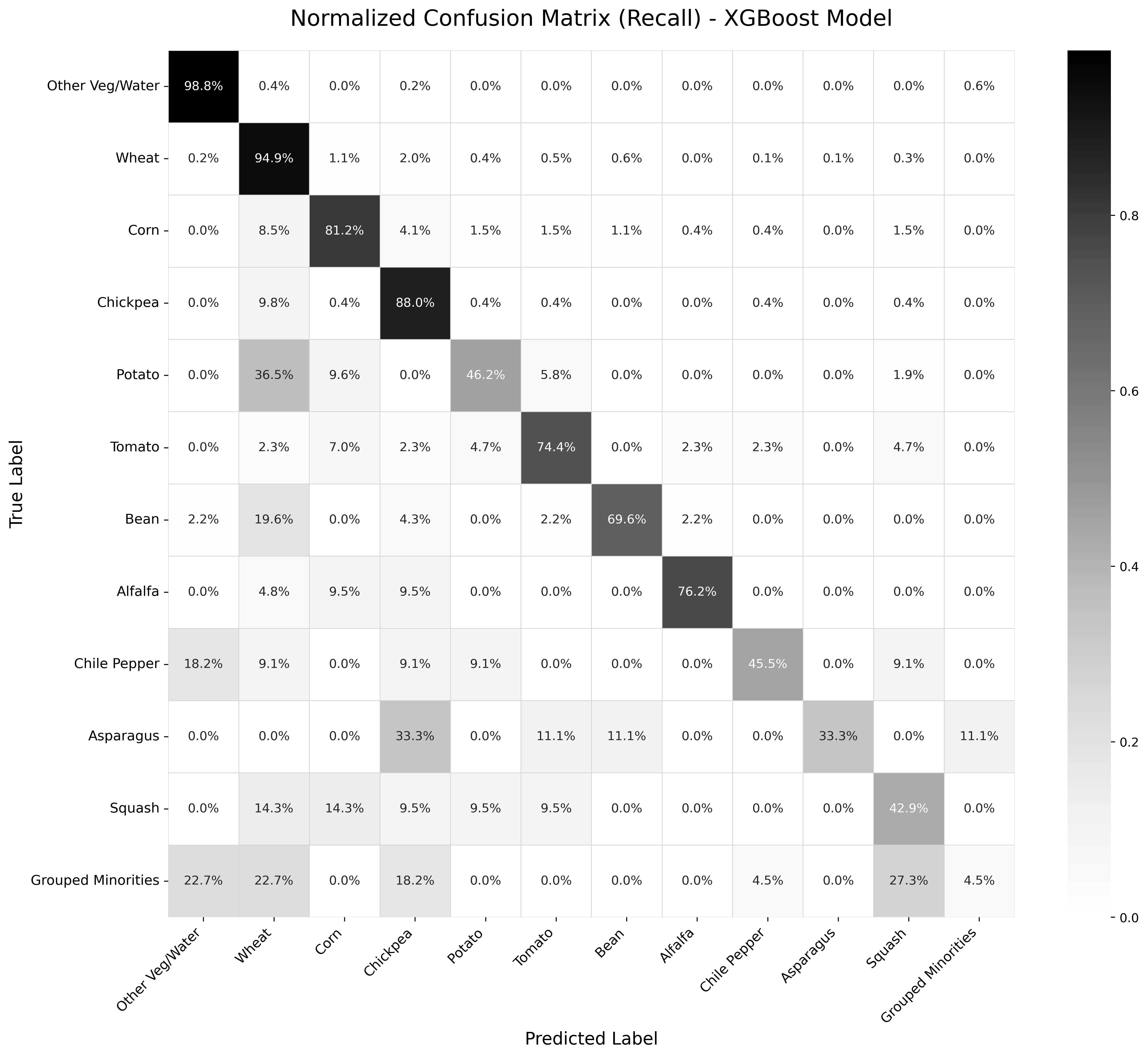 To visually assess the model’s behavior, the normalized confusion matrix is presented in Figure 13.1. The strong diagonal, with recall values of 98.8% for Other Veg/Water and 94.9% for Wheat, confirms the model’s high accuracy for the majority classes. However, the off-diagonal values highlight specific areas of confusion. For instance, Potato is frequently misclassified as Corn (36.5% of the time), and a notable portion of Onion samples are also confused with Corn (19.6%). This suggests that these crops may share similar spectral profiles at certain growth stages within the analyzed period. As expected, the model struggles most with the Grouped Minorities class, which has a recall of only 4.5% and is primarily confused with the dominant Wheat and Other Veg/Water classes.