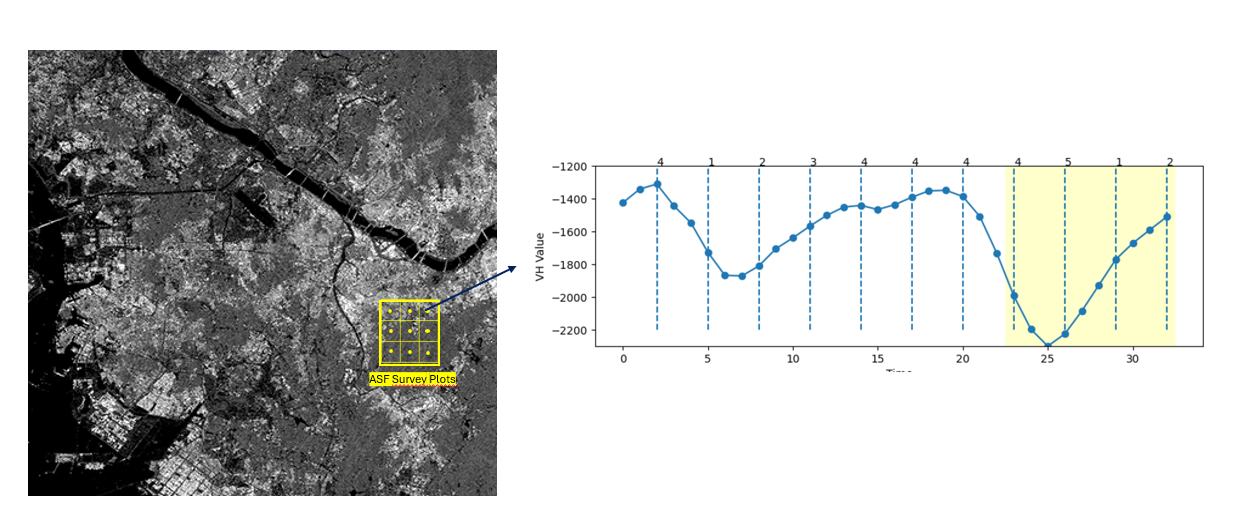 In this research, Statistics Indonesia-BPS collaborate with the National Research and Innovation Agencies-BRIN for acquiring the Sentinel 1. BRIN give the access of Analysis Ready Data (ARD) data of the Sentinel 1 in 12 days intervals and acquired since 2023 until 2024. The data is further composed into time series data and filtered to the aligned ASF sampling plot, as shown in Figure 19.1.