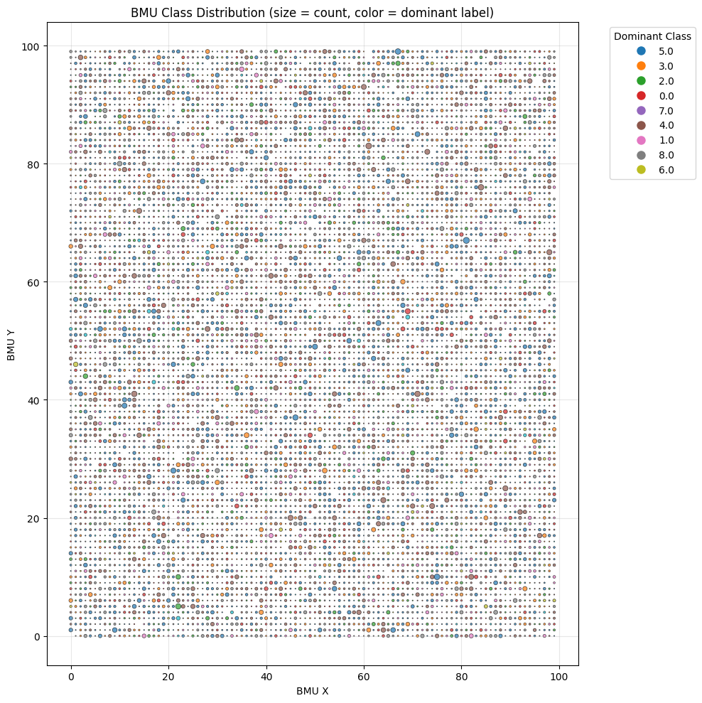 The Best Matching Unit (BMU) plot is a diagnostic tool for assessing the quality and structure of Self-Organizing Map (SOM) training. Each point represents a neuron, where the circle size indicates how frequently it was selected as the best match, and the color shows its dominant class. Larger circles suggest neurons that represent more input samples, while smaller ones may indicate less representative or noisy data. As depicted, many neurons likely correspond to noise and should be filtered out to produce cleaner training data.