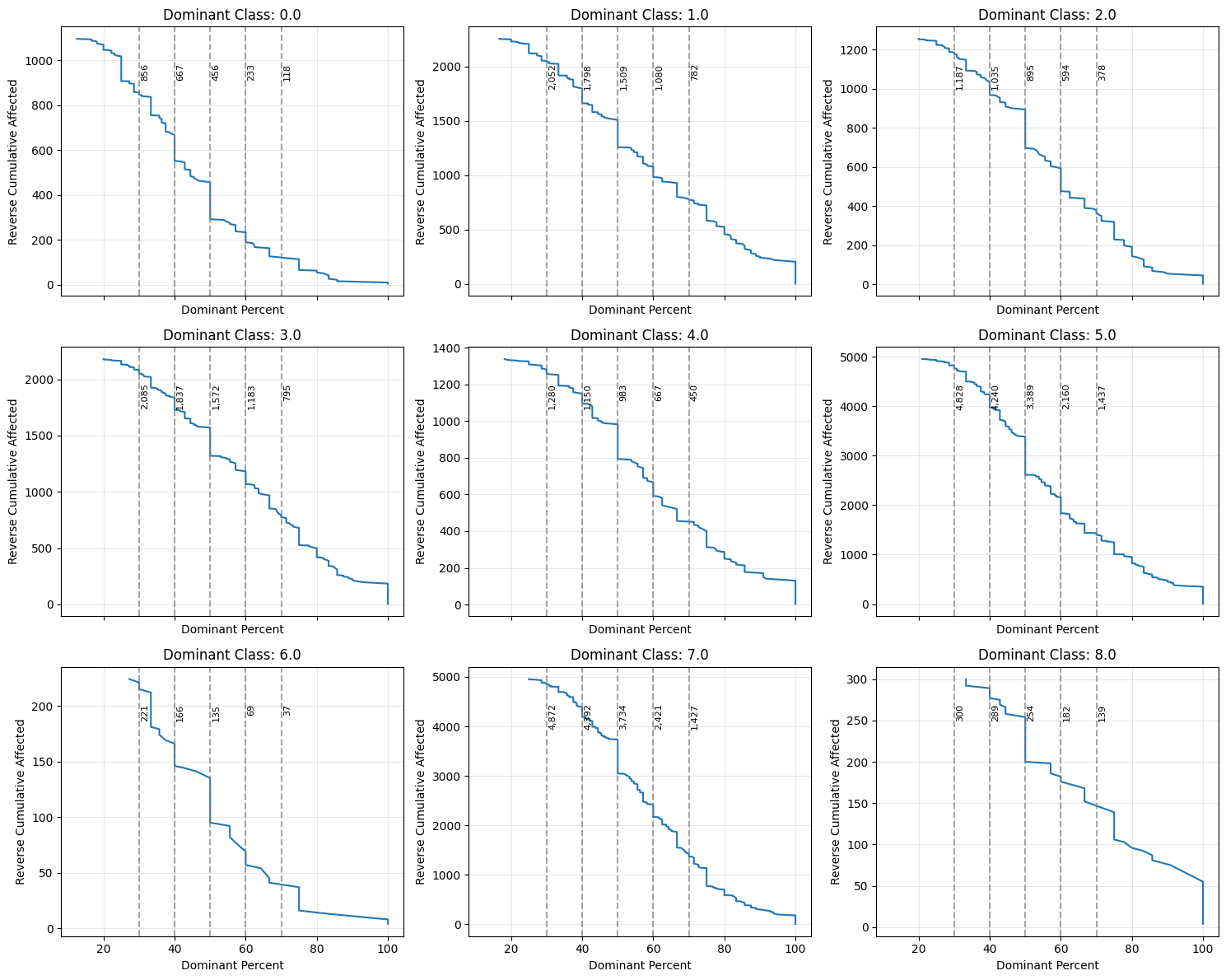 To filter the data, we select neurons with the most homogeneous class composition—indicated by a high dominance of a single class within the neuron. The cumulative density graph helps determine how many data points are affected at each purity level. In this case, we set a 50% threshold for class dominance and remove neurons with a lower value. From the remaining neurons, we retain only the data points that belong to the dominant class of each neuron.