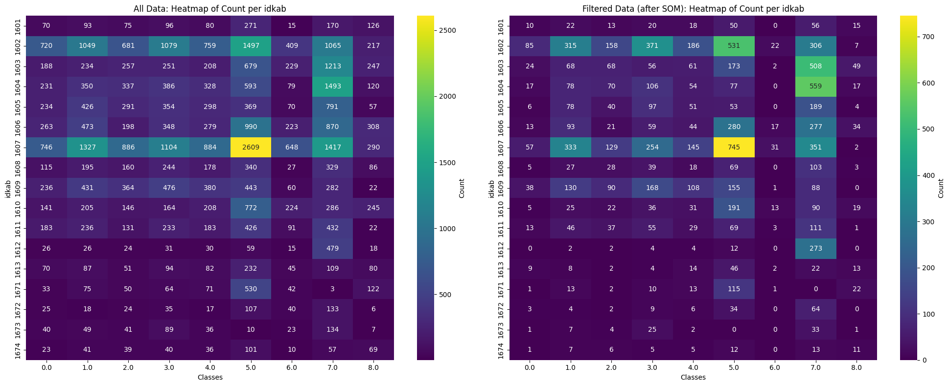 axs[1].set_title('Filtered Data (after SOM): Heatmap of Count per idkab')