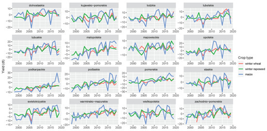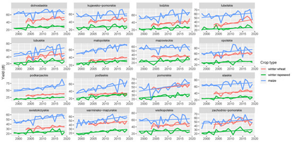 The reference data for the crop yield forecasting model consisted of official yield statistics provided by Statistics Poland at NUTS-2 and LAU (local administrative units) levels (Figure 21.3). The NUTS-2 data included winter wheat, winter rapeseed, and maize yields expressed in decitons [dt] for the period 1997–2019. At the LAU level, the length of the time series was shorter, and also inconsistent among administrative units (Figure 21.4).