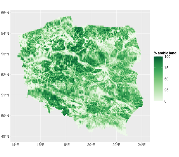 A binary crop mask was derived from the Corine Land Cover version 2018 classification, freely distributed by the European Environmental Agency, by extracting 2.1.1 (non-irrigated arable land) and 2.4.2 (complex cultivation patterns) classes as arable land. Further, the binary mask was used to generate fractional arable land products at spatial resolutions matching the Sentinel-3, MODIS, and ERA-5 products. These fractional estimates served as weights to spatially aggregate satellite and agro-meteorological variables for the administrative units. An example of the extent of arable land represented as fractions is visualized for Poland in Figure 21.2.