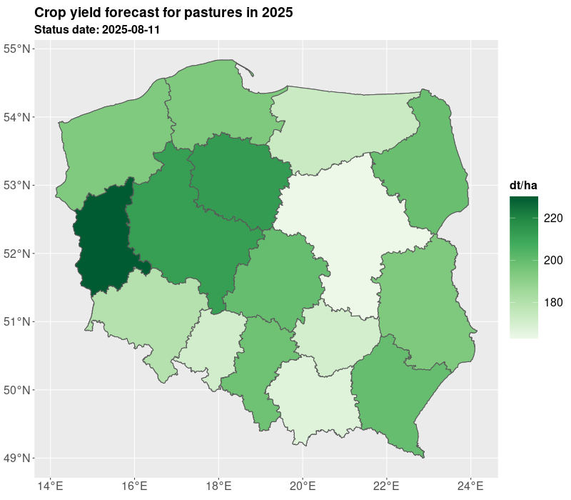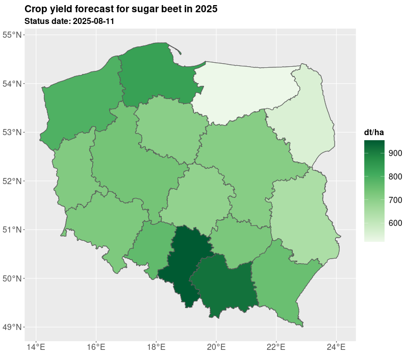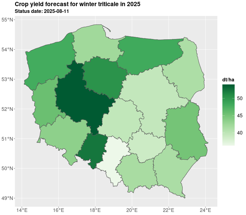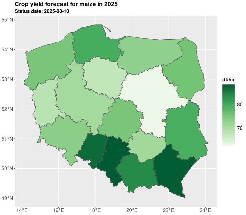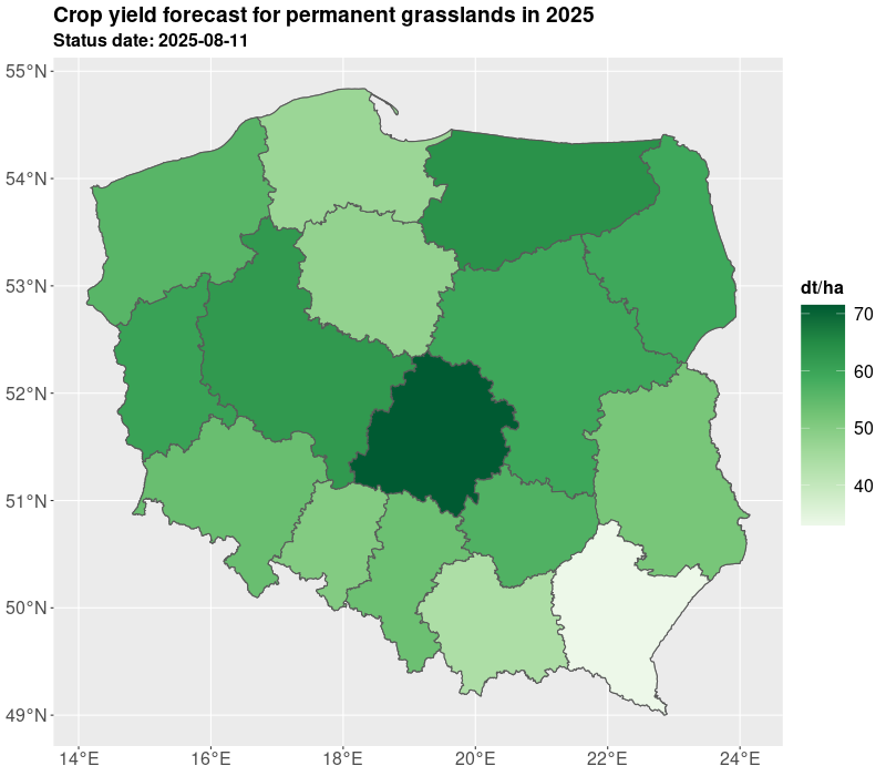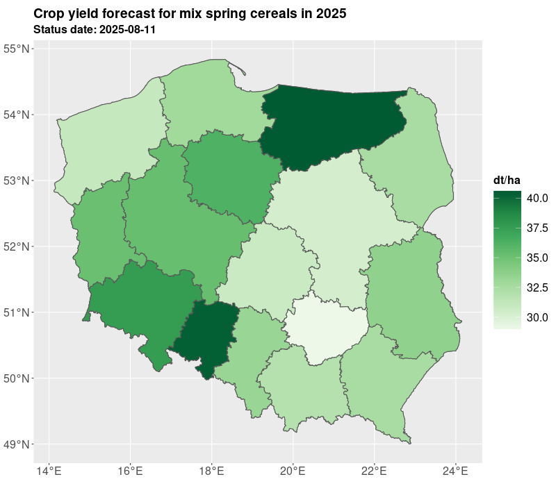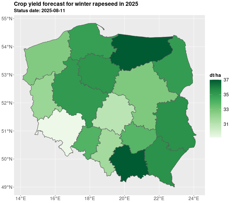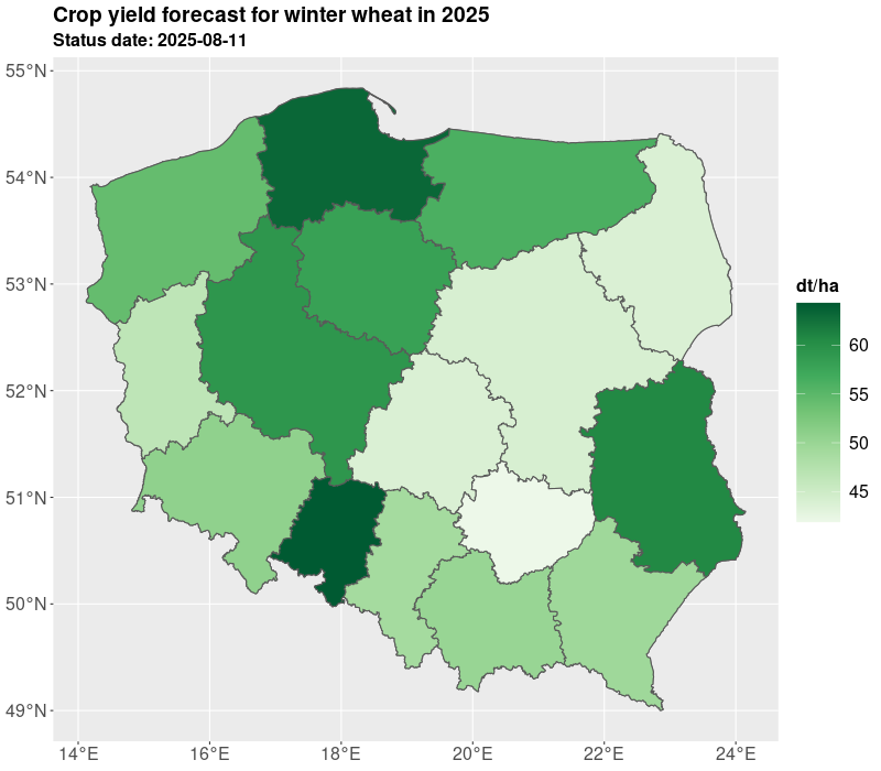We presented yields for all administrative levels of the country (voivodships, counties, communes). The estimates are derived on the basis of the expected yield. The results of yielding as well as GDD, NDVI are published in Statistics Poland geostatistical portal. Currently, Statistics Poland present estimates based on satellite imagery for 10 crops: winter barley, winter rye, winter triticale, winter wheat, spring cereals, winter rapeseed, maize, sugar beet, pastures, and permanent grasses.