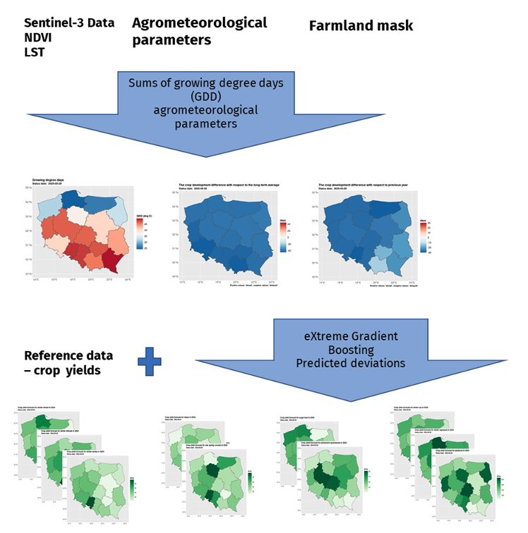 The system exploits Copernicus data sets and climate reanalysis at a global scale, and thus can be applied at any location. The system is dedicated for predicting yields of several crops, namely, winter wheat, winter rapeseed, or maize. Although, the particular software solutions have been developed for yield predictions in Poland, the concept of the model can be successfully used in any country. Obviously, other data bases, reference information or different settings of parameters should be then included.