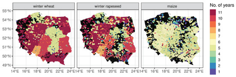 In total, there were 170 predictors (c) but the number of years (r) varied between crop types and administrative units due to the reference data availability. For LAUs, the number of years is presented in Figure 21.4, whereas for NUTS-2, it equaled 17 for winter wheat and 22 for winter rapeseed and maize.