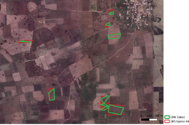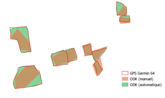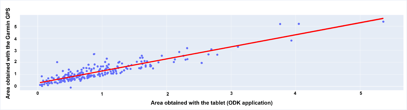 Several measurements deviate significantly from the reference, which comes from the use of the manual mode in ODK (i.e. enumerators to manually encode GPS measures at the inflection points of the plot). Errors in the area measurements were caused by: