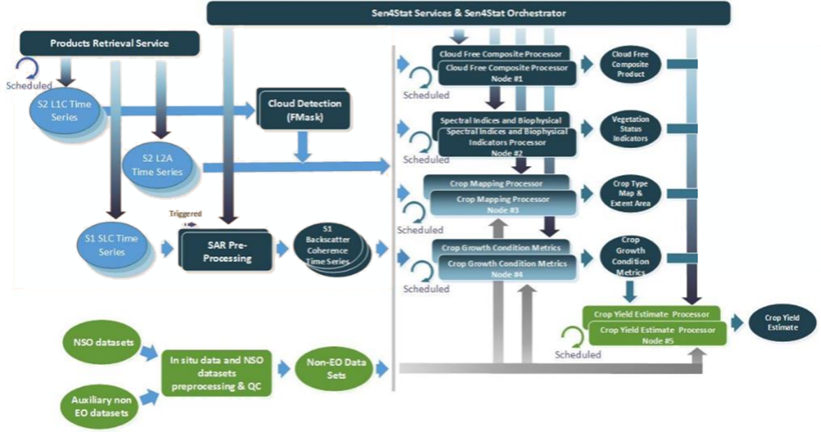 The Sen4Stat toolbox is a standalone operational processing chain which aims at facilitating the uptake of Earth Observation data in the official processes of National Statistical Offices, since the early stages of the agricultural surveys to the production of statistics. It automatically ingests and processes Sentinel-1 and Sentinel-2 time series in a seamless way for operational crop mapping and yield modelling, using ground data provided by national statistical surveys. It generates a set of EO-based products, such as time series of biophysical indicators, crop type maps and yield estimates. These EO products are then integrated with the agricultural survey to improve the statistics. Different types of statistics improvements are targeted by the system: (i) reduction of the estimates error, (ii) disaggregation to smaller administrative units, (iii) provision of timely crop area and yield estimators and (iv) optimization of sampling design by using maps to build or update sampling master frames. EO products are also used to support the quality control of the survey data.