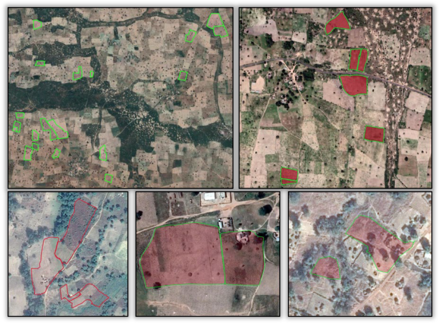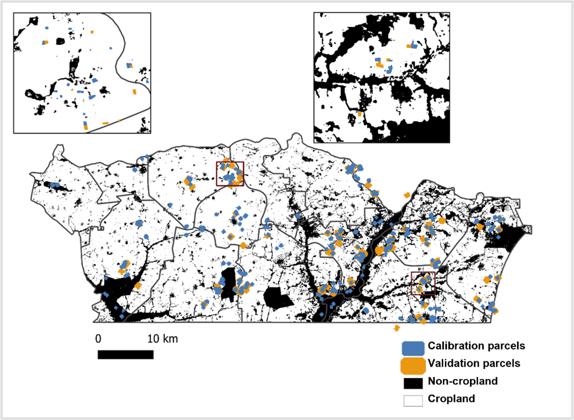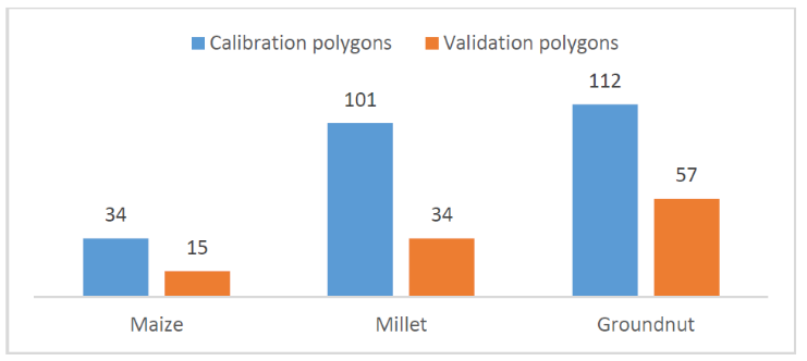 As part of the pilot, enumerators were instructed to collect data on non-crop land cover classes (e.g., fallow, built-up, water) through the ODK application. However, only a limited number of non-crop polygons were recorded. Several key classes were missing. To fill this gap, additional non-crop features were manually delineated using very high-resolution satellite imagery. In total, 50 non-crop polygons were available for model calibration.