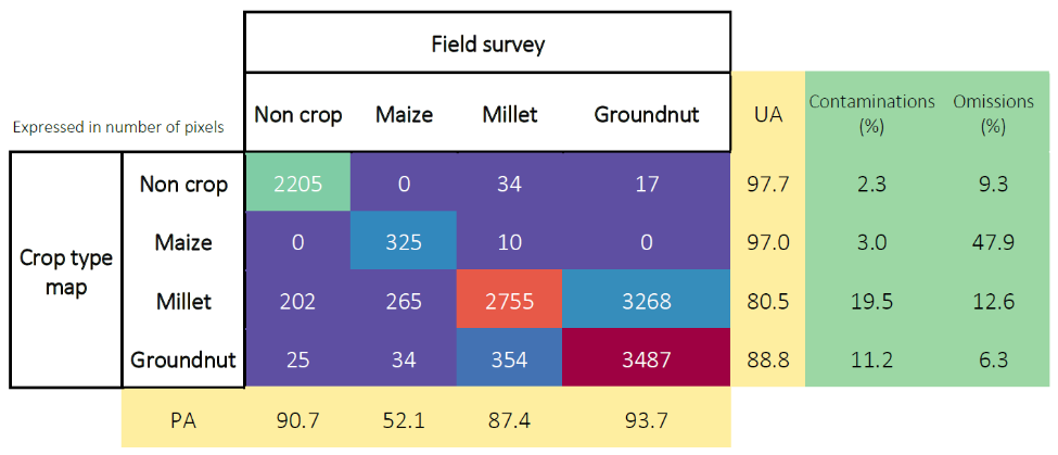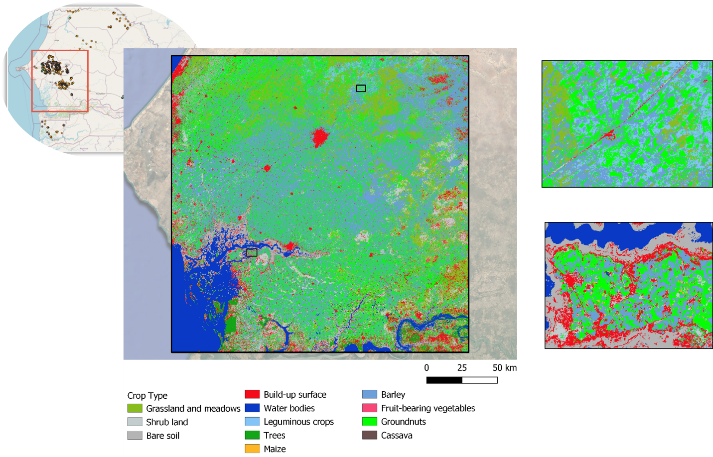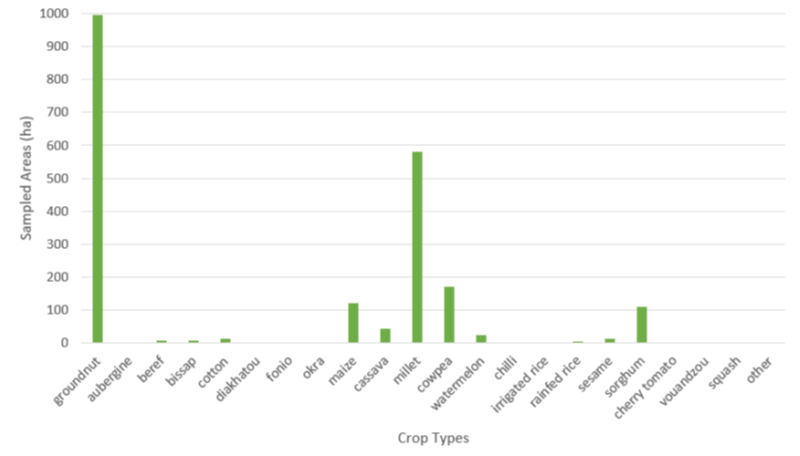 A national crop type map was also generated, focusing only on the main crops for which enough samples were available (groundnut, maize, cassava, millet, cowpea, rice and sorghum). The overall accuracy was 78%. The patterns of the fields were generally well identified, showing that the Sentinel-2 10-meter spatial resolution has the capacity of mapping crop types at field-level. However, the map was affected by significant confusion between crops.