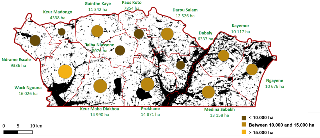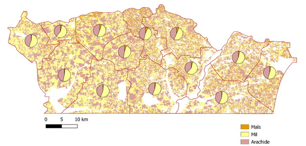 Crop area statistics were derived from the crop type map to support EO-based agricultural estimations at the municipality level. Figure 10.15 (a) shows an estimation of the areas per crop using only the remote sensing data per municipality in the Nioro du Rip department while the bottom illustration gives an estimation of the area cultivated in each municipality by the same remote sensing approach. The surface areas per crop were calculated by counting classified pixels and applying bias correction using the confusion matrix.