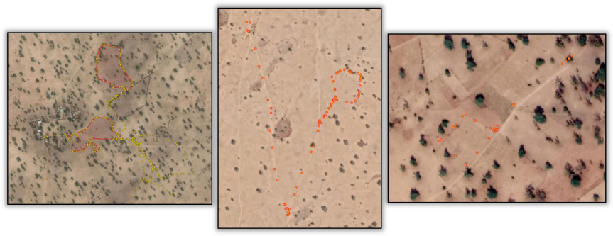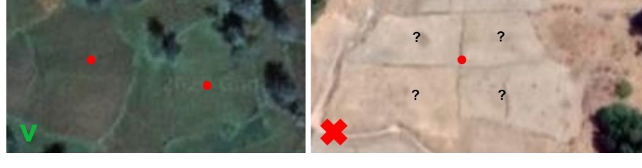 First, all points located too close to roads and buildings were removed and points located less than 20 meters apart but associated with different crops are removed. The second stage of the quality control addressed the important challenge of working with GPS points (and not polygons), i.e. checking if the point is located in the middle of the parcel. For the sake of illustration, Figure 10.3 shows two situations where (i) point was taken at the middle of the parcels, thus making the parcels easily identifiable (left) and (ii) point was taken on the path along the parcels which makes almost impossible to know which parcel it refers to (right).