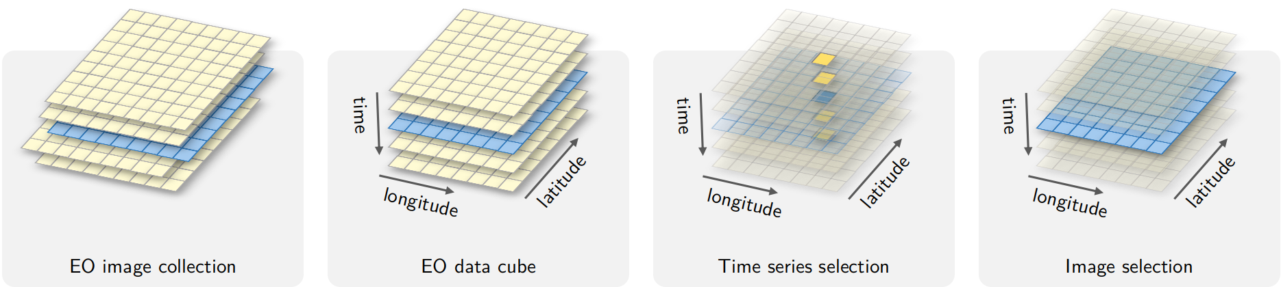 A regular EO data cube is a partition of the Earth’s surface which covers the area in periodic intervals. Regular data cubes are derived by ARD images by filling coverage gaps, accounting for cloud coverage, and reprocessing irregular temporal coverage to regular periods. Also, regular data cubes can cover more than a single coordinate projection zone, so as to be defined in large areas.