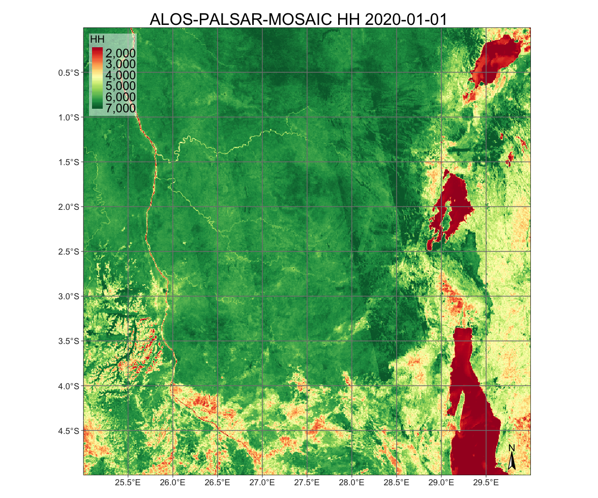 The following example shows how to retrieve a subset of the ALOS-PALSAR mosaic for year 2020, for an area near the border between Congo and Rwanda.