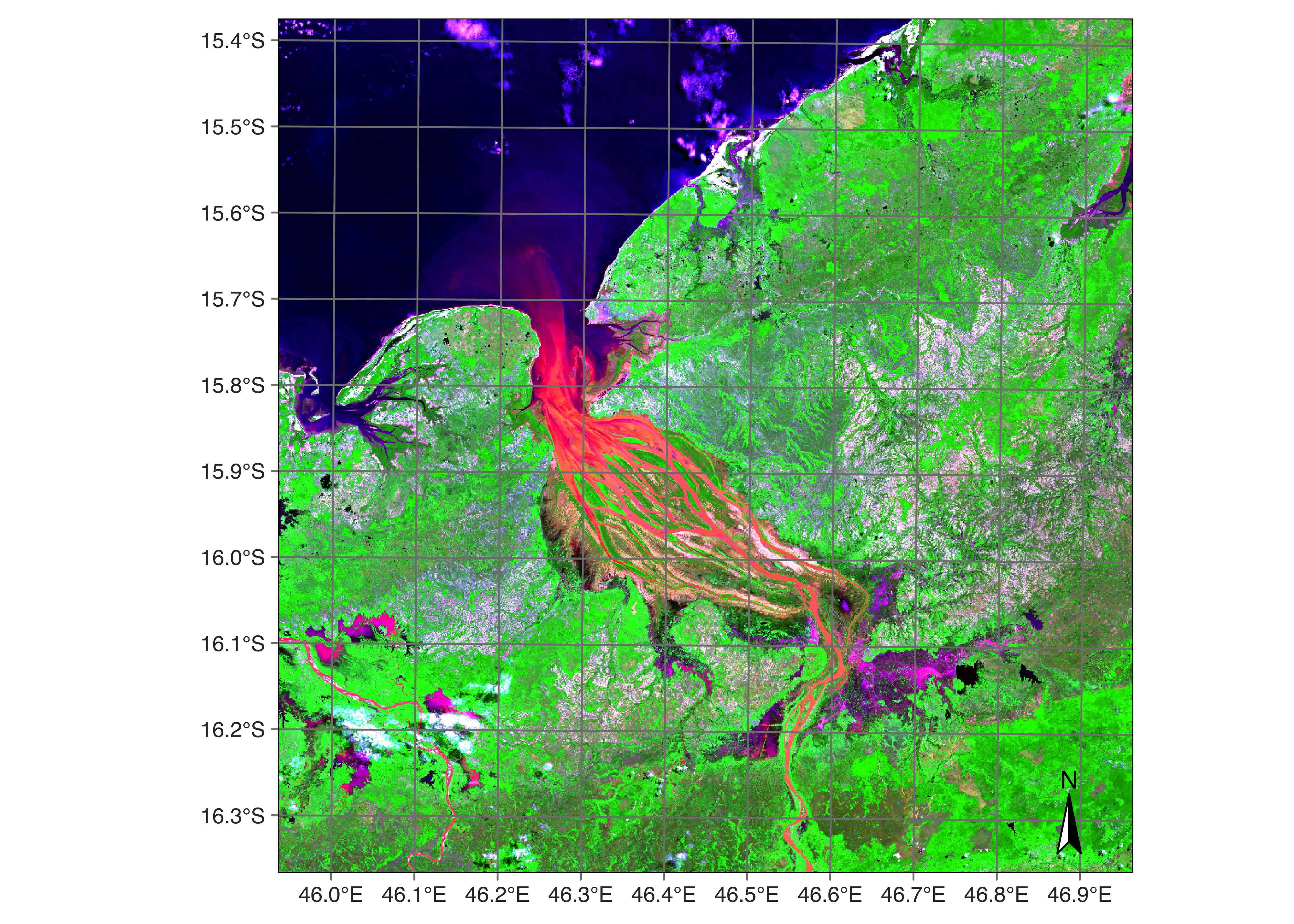 Access to DEAFRICA Sentinel-2 images can be done wither using tiles or roi parameter. In this example, the requested roi produces a cube that contains one MGRS tiles (“35LPH”) covering an area of Madagascar that includes the Betsiboka Estuary.