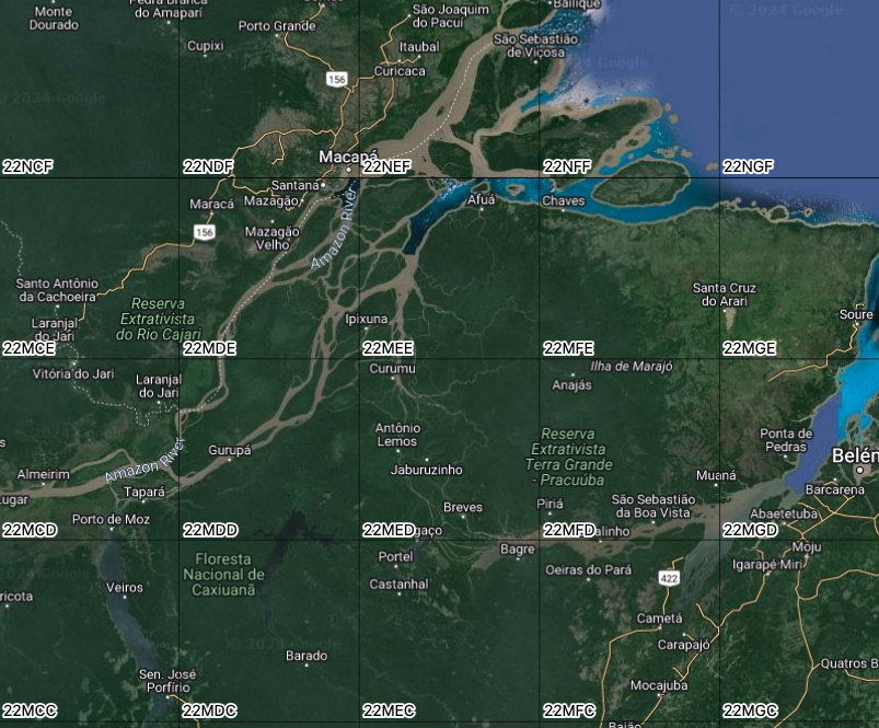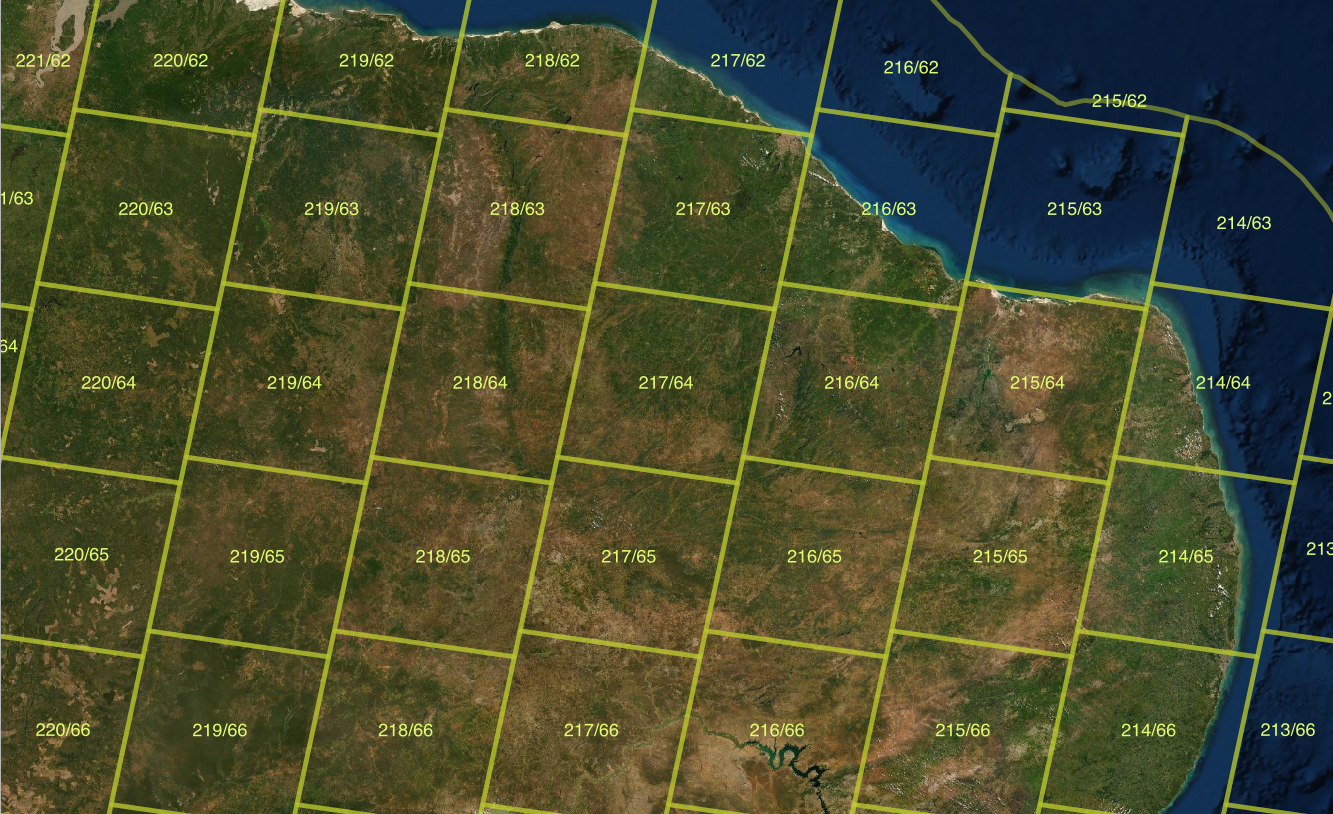 ARD image collections are organized in spatial partitions. Sentinel-2/2A images follow the Military Grid Reference System (MGRS) tiling system, which divides the world into 60 UTM zones of 8 degrees of longitude. Each zone has blocks of 6 degrees of latitude. Blocks are split into tiles of 110 \(\times\) 110 km\(^2\) with a 10 km overlap. Figure Figure 2.2 shows the MGRS tiling system for a part of the Northeastern coast of Brazil, contained in UTM zone 24, block M.