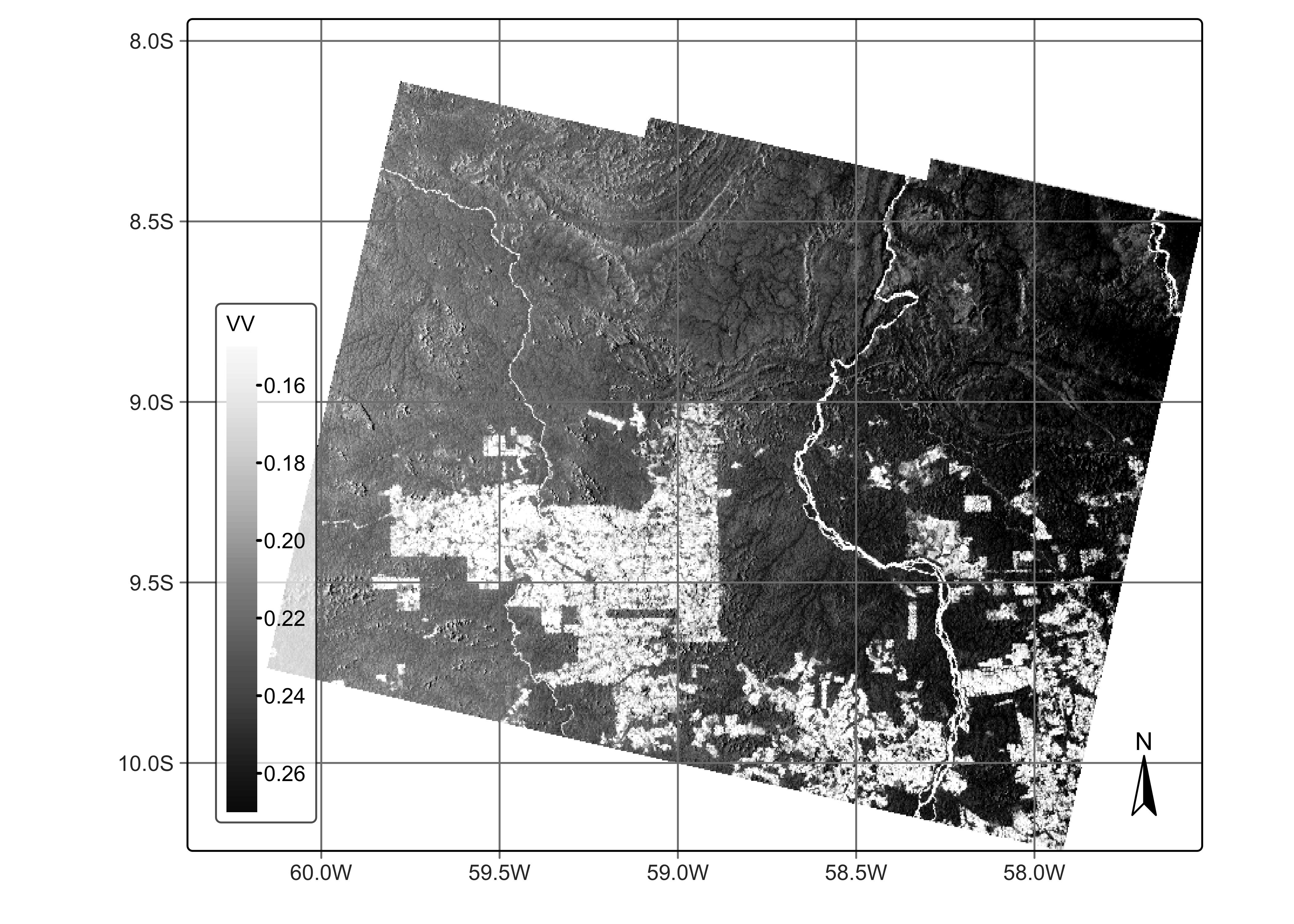 The following example shows how to create a data cube of S1 GRD images over a region in Mato Grosso Brazil that is an area of the Amazon forest that has been deforested. The resulting cube will not follow any specific projection and its coordinates will be stated as EPSG 4326 (latitude/longitude). Its geometry is derived from the SAR slant-range perspective; thus, it will appear included in relation to the Earth’s longitude.
