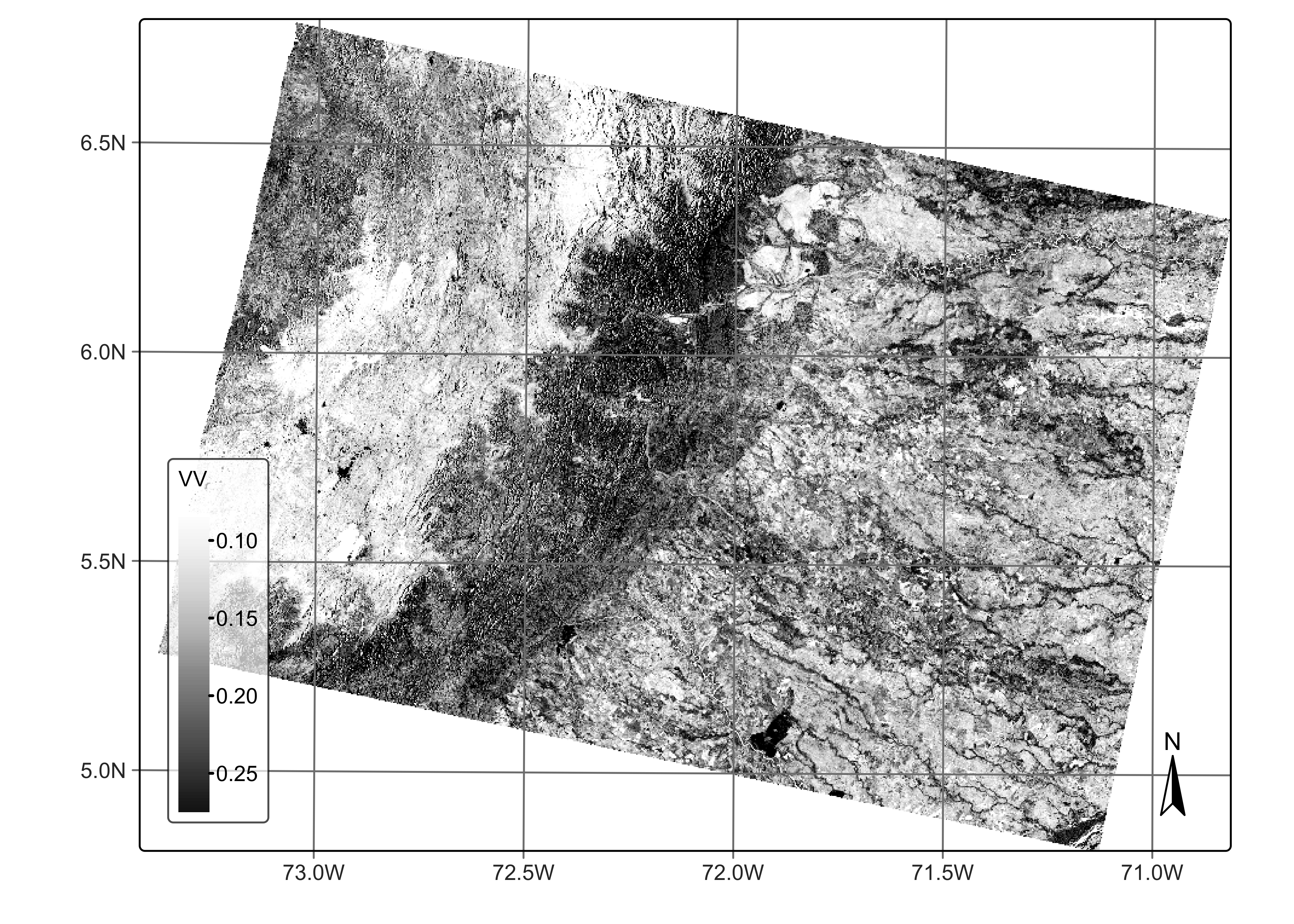 The above image is from the central region of Colombia, a country with large variations in altitude due to the Andes mountains. Users are invited to compare this images with the one from the SENTINEL-1-GRD collection and see the significant geometrical distortions of the GRD image compared with the RTC one.