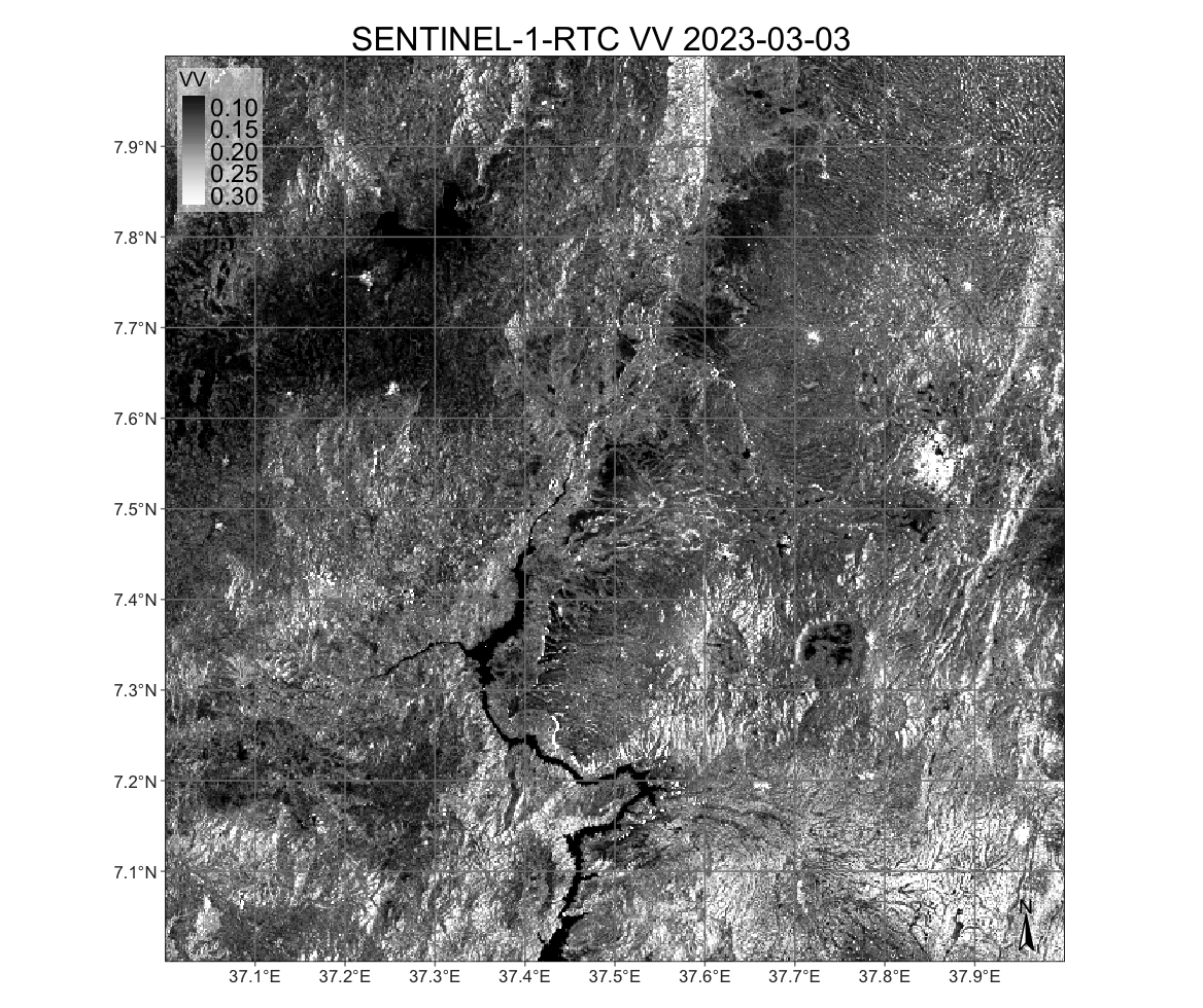For more details, please refer to the S1-NRB product website. Global coverage is expected to grow as ESA expands the S1-RTC archive. The following example shows an S1-RTC image for the Rift valley in Ethiopia.