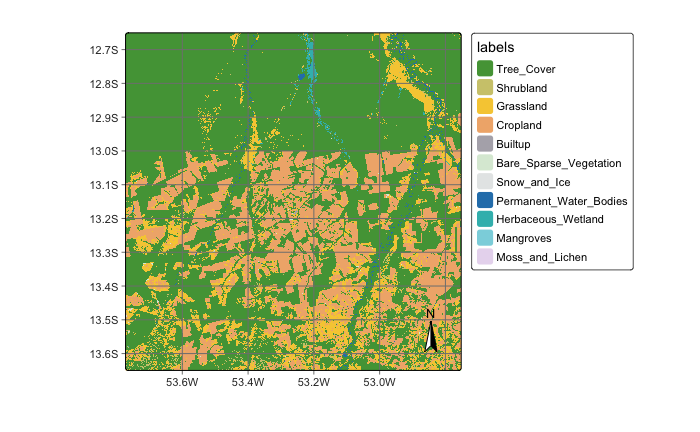Terrascope is online platform for accessing open-source satellite images. This service, operated by VITO, offers a range of Earth observation data and processing services that are accessible free of charge. Currently, sits supports the World Cover 2021 maps, produced by VITO with support form the European Commission and ESA. The following code shows how to access the World Cover 2021 convering tile “22LBL”. The first step is to use sits_mgrs_to_roi() to get the region of interest expressed as a bounding box; this box is then entered as the roi parameter in the sits_cube() function. Since the World Cover data is available as a 3\(^\circ\) by 3\(^\circ\) grid, it is necessary to use sits_cube_copy() to extract the exact MGRS tile.