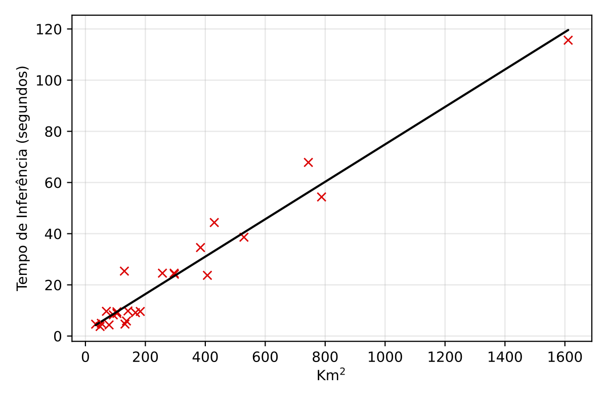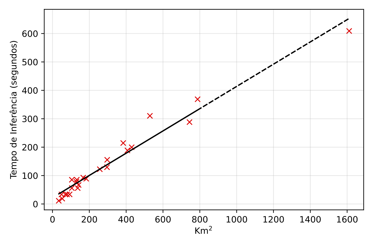 The total inference time exhibits a near-linear relationship with the territorial extension of the area being processed, implying that doubling the area roughly doubles the processing time. For instance, on a high-end consumer GPU like an NVIDIA RTX 4090, processing smaller regions like Sergipe (approx. 22,000 km\(^2\)) takes about 2.39 hours. Scaling up, the inference for the entire national territory (approx. 8.5 million km\(^2\)) is estimated to take around 925.88 hours, or approximately 38.58 days. On a more powerful, professional-grade GPU such as an NVIDIA DGX A100, these times are significantly reduced due to superior processing capabilities; Sergipe would take about 0.45 hours, and the entire national territory could be processed in approximately 172.90 hours, or about 7.20 days. This difference highlights the importance of selecting appropriate hardware for large-scale production deployments.