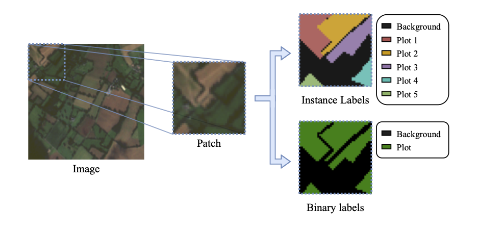 This binary simplification is chosen for several reasons. It reduces the complexity of the labeling task, making it more feasible to generate large annotated datasets. It also allows models to generalize across diverse agricultural contexts, as the distinction between field'' andnon-field’’ is more consistent than specific crop types. This addresses the challenge that detailed crop type labels may not be easily transferable across diverse geographical contexts or may require more specialized and resource-intensive annotation efforts. By simplifying the problem to binary segmentation, publicly available datasets like PASTIS [3] and AI4Boundaries [2] can be readily binarized and utilized as source datasets for supervised training, enabling subsequent transfer to target regions where detailed crop-specific labels might be scarce or non-existent. This streamlined approach allows for rapid prototyping and deployment of base models.