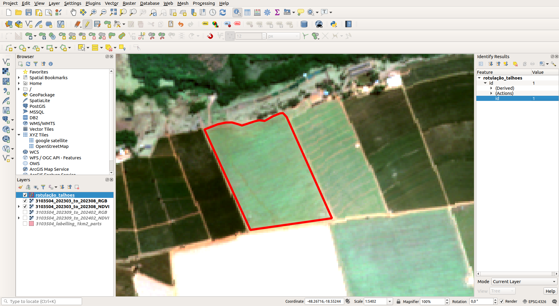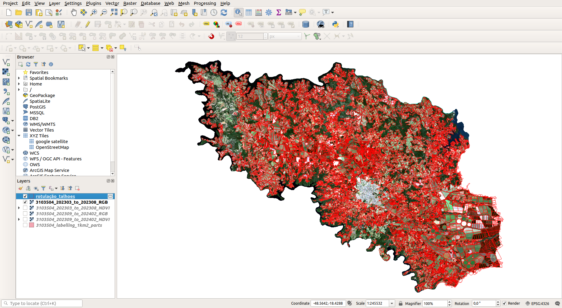 After loading the imagery, the map is prepared for delimiting agricultural parcels using vector editing tools within the software. Annotators draw polygons that correspond to cultivation areas. It is crucial to delimit the parcel boundaries with extremely high precision, avoiding external areas such as roads, urban structures, natural forests, or non-cultivated vegetation. Such inclusions could introduce noise and inaccuracies into the training data, interfering with subsequent model learning and leading to erroneous predictions. The objective is to ensure that the separation of agricultural areas from non-agricultural ones is consistent with the reality observed in the imagery.