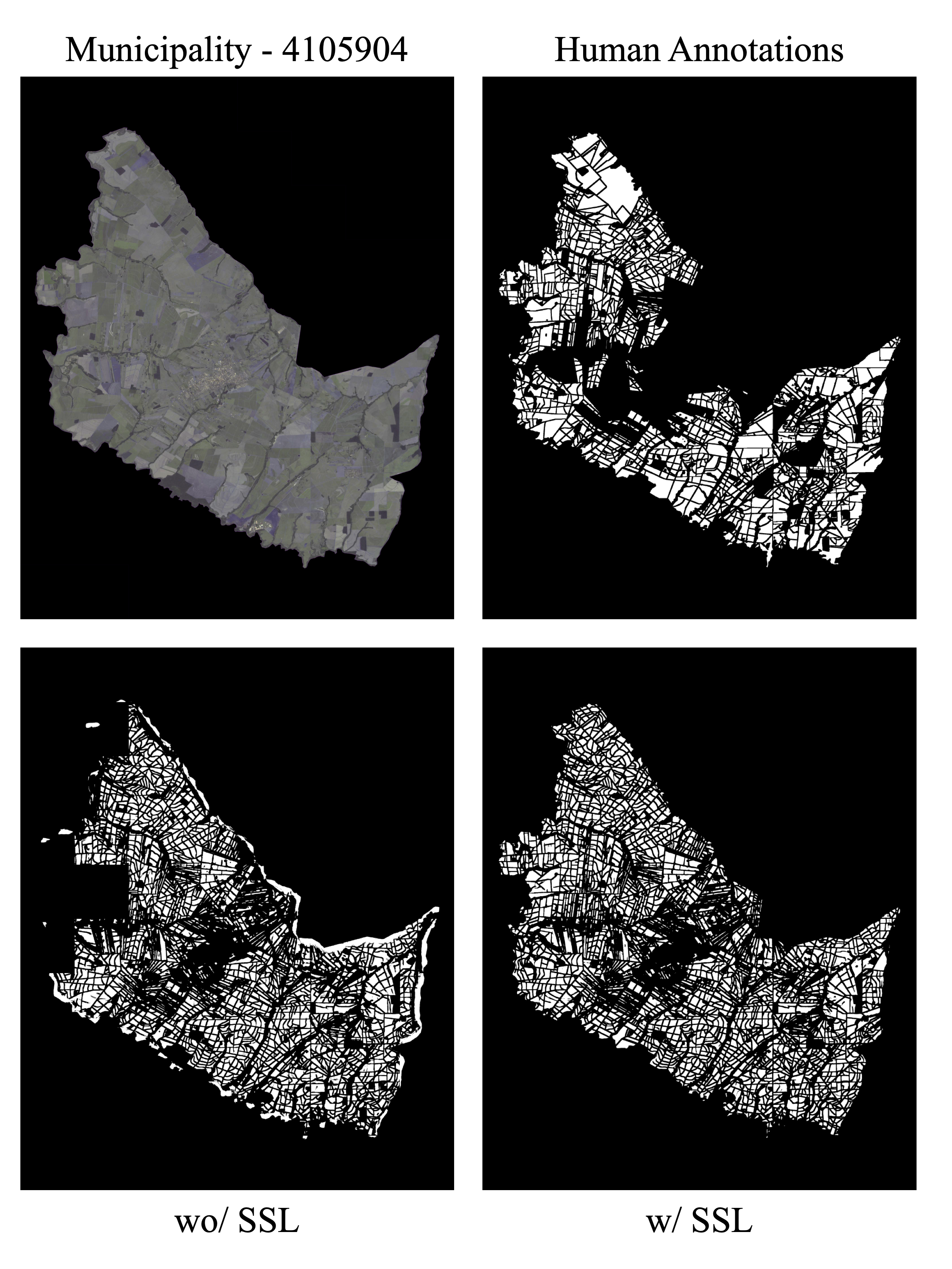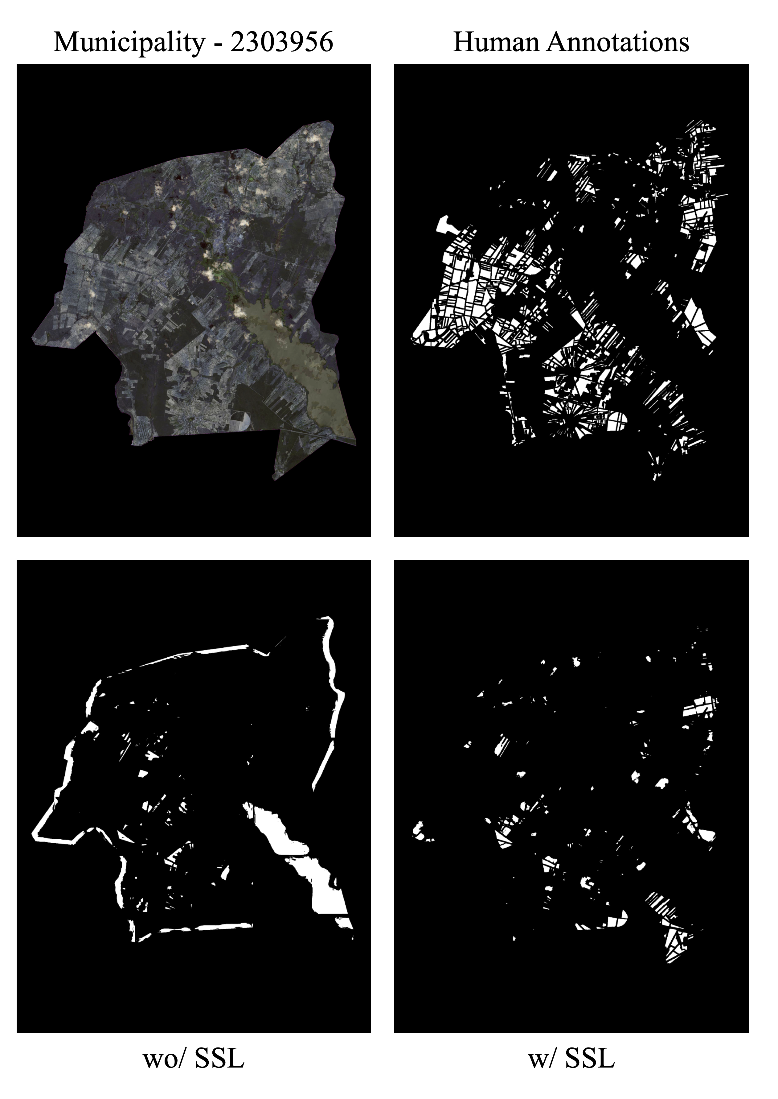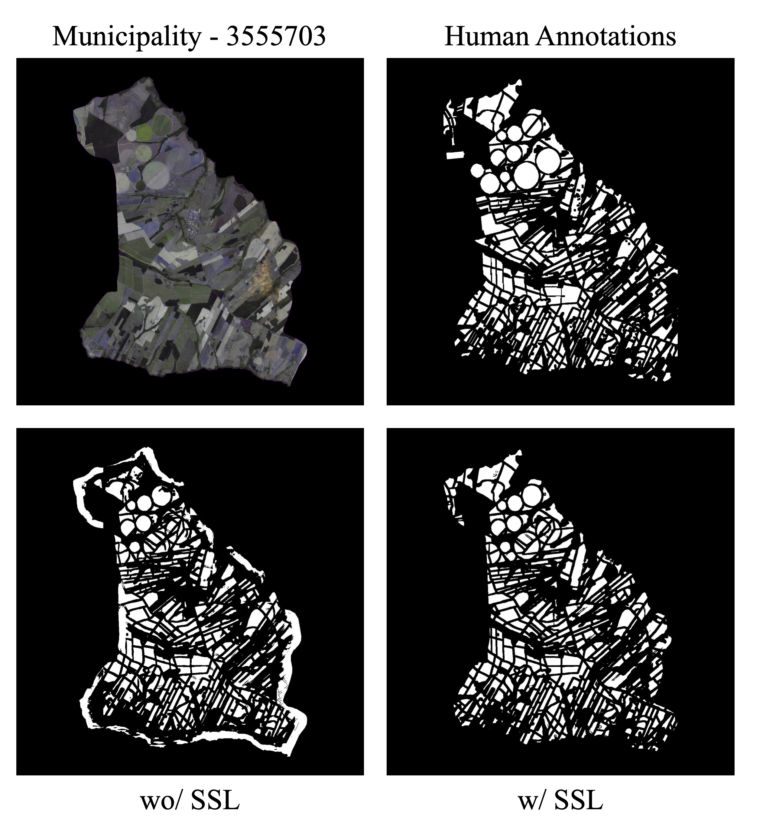 These visual results are supported by the higher AR values shown in Table 11.3. In some cases, SSL use led to improvements in metrics AP and AR. In the city of Cândido (SP), for example, AP and AR increased from 0.2177 and 0.3383 to 0.4063 and 0.5793 with SSL. This difference may be significant for implementing large-scale plot delineation operations, as illustrated in Figure 11.14.