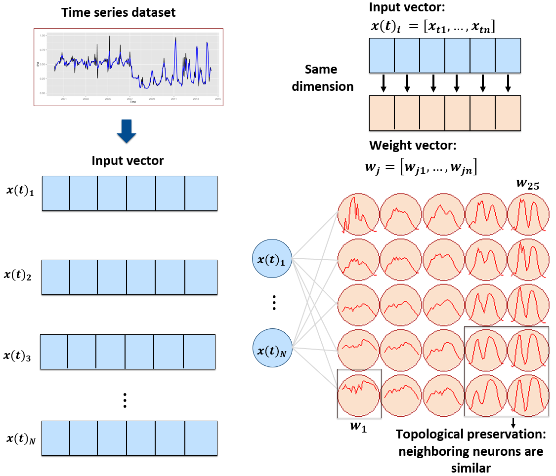 The input data for quality assessment is a set of training samples, which are high-dimensional data; for example, a time series with 25 instances of 4 spectral bands has 100 dimensions. When projecting a high-dimensional dataset into a 2D SOM map, the units of the map (called neurons) compete for each sample. Each time series will be mapped to one of the neurons. Since the number of neurons is smaller than the number of classes, each neuron will be associated with many time series. The resulting 2D map will be a set of clusters. Given that SOM preserves the topological structure of neighborhoods in multiple dimensions, clusters that contain training samples with a given label will usually be neighbors in 2D space. The neighbors of each neuron of a SOM map provide information on intraclass and interclass variability, which is used to detect noisy samples. The methodology of using SOM for sample quality assessment is discussed in detail in the reference paper [4].