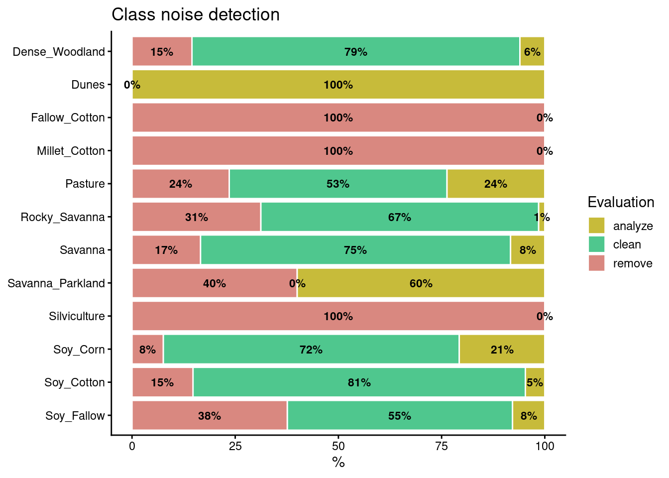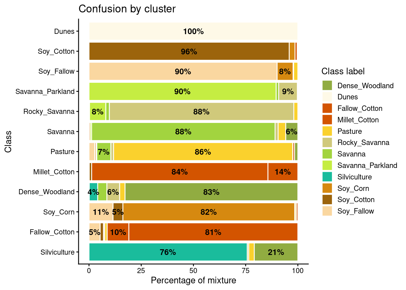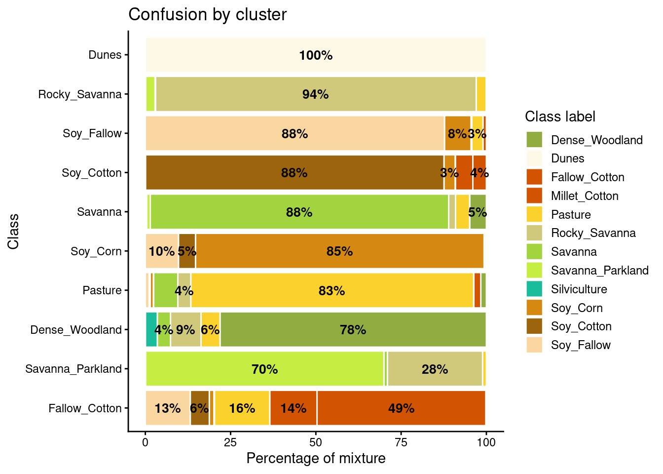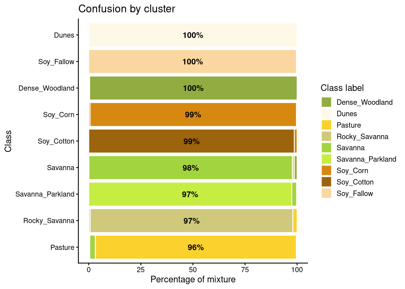 Many labels are associated with clusters where there are some samples with a different label. Such confusion between labels arises because sample labeling is subjective and can be biased. In many cases, interpreters use high-resolution data to identify samples. However, the actual images to be classified are captured by satellites with lower resolution. In our case study, a MOD13Q1 image has pixels with 250 m resolution. As such, the correspondence between labeled locations in high-resolution images and mid to low-resolution images is not direct. The bar plot shows some confusion between the labels associated with the natural vegetation typical of the Brazilian Cerrado (Savanna, Savanna_Parkland, Rocky_Savanna). This mixture is due to the large variability of the natural vegetation of the Cerrado biome, which makes it difficult to draw sharp boundaries between classes. Some confusion is also visible between the agricultural classes. The Fallow_Cotton class is a particularly difficult one since many of the samples assigned to this class are confused with Soy_Cotton and Millet_Cotton.