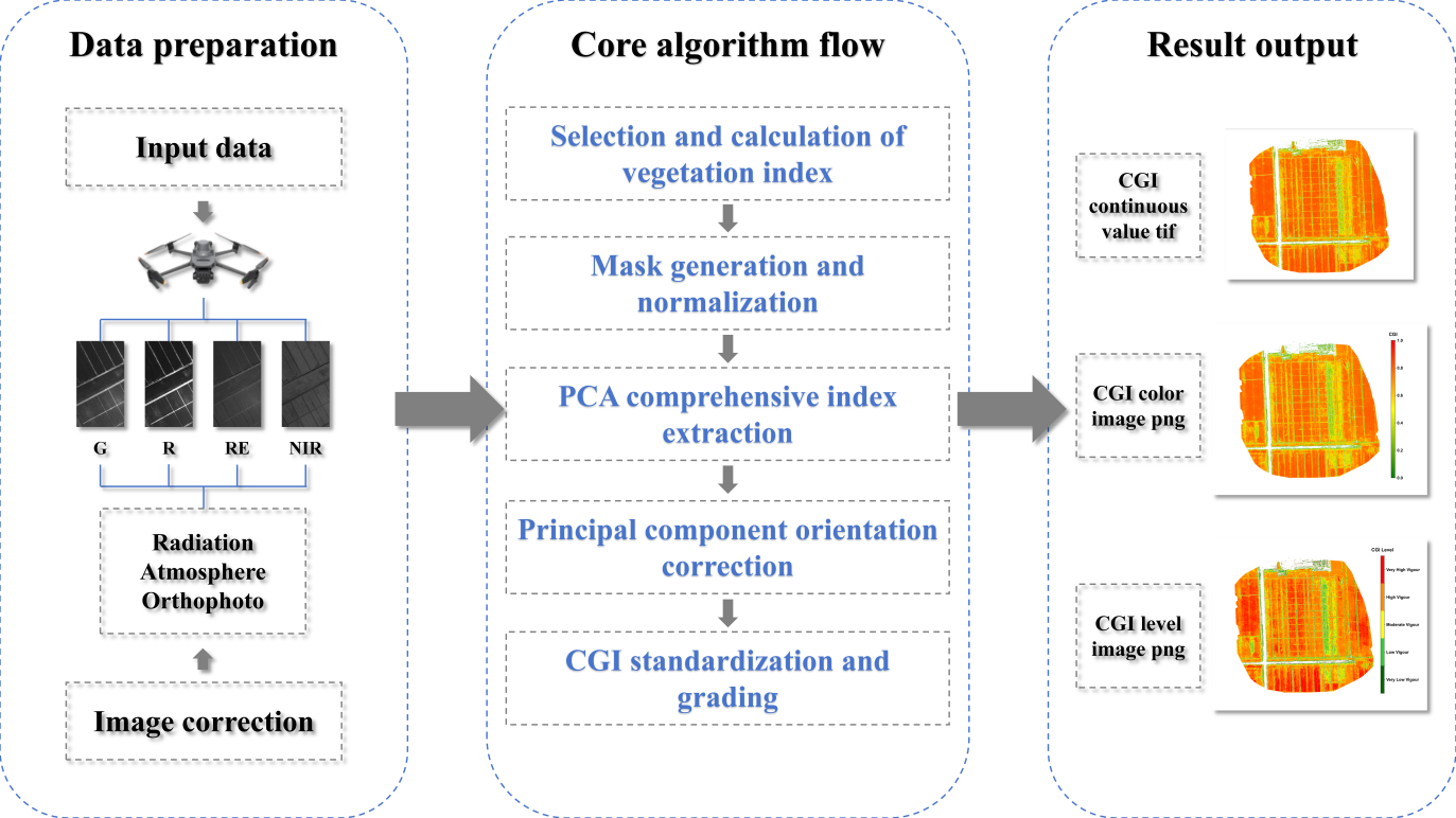 The CGI algorithm uses UAV multispectral imagery as input and enables quantitative monitoring of crop growth through a series of automated processing steps. The technical workflow includes: (1) selection and calculation of vegetation indices; (2) masks generation and indices normalization; (3) extraction of composite indicators based on principal component analysis (PCA); (4) adjustment of principal component directions to ensure positive correlation with growth status; (5) mapping of continuous CGI values to the 0–1 range and classification; and (6) output of standardized result products. The following sections elaborate these six steps in detail.