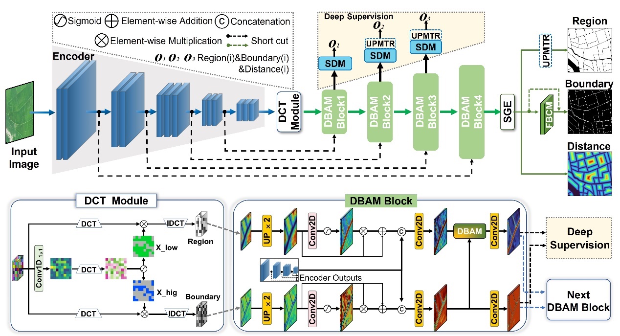 In the DCP-MTL model, a Discrete Cosine Transform (DCT) module is introduced for frequency-domain feature extraction, specifically decoupling high-frequency features to enhance the representation capability of parcel boundaries. Then, combined with deep supervision techniques, a Dual-Branch Attention Module (DBAM) and an Uncertainty Perception Module for Transition Regions (UPMTR) are designed to address issues in multi-scale CFPs, such as incomplete extraction of large parcels, failure to separately extract small or fragmented parcels, and adhesion between parcels. Finally, together with the Field Boundary Connectivity Module (FBCM), they form an integrated decoding module aimed at enhancing the connectivity of blurred parcel boundaries and improving the separability of densely adhered parcel regions.