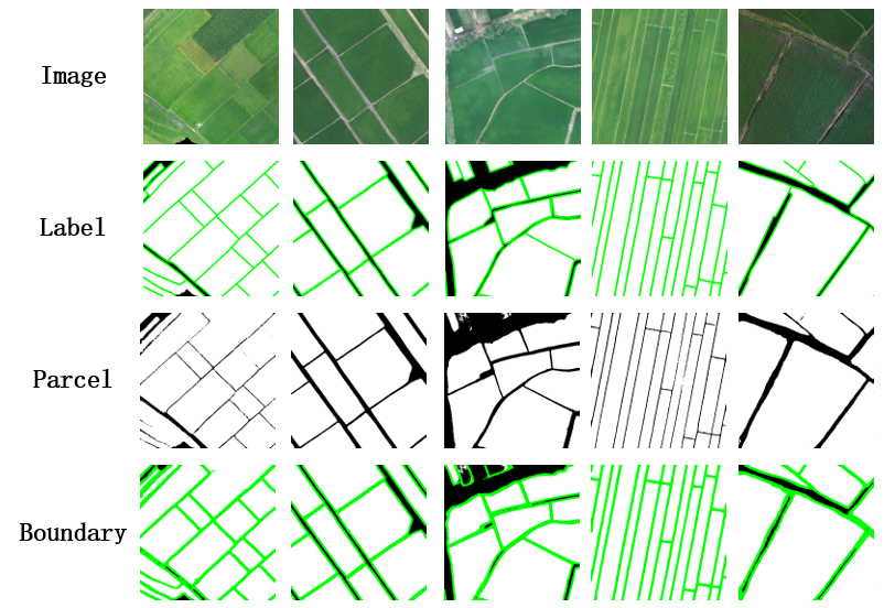 Data resampling. Resample the original imagery from 0.05 m resolution to 0.2 m, and then convert the digitized vector parcel data into raster format consistent with the resampled imagery, including both parcel regions and parcel boundaries: on the one hand, shrink the vector parcel polygons inward to generate parcel region masks and rasterize them to obtain region labels; on the other hand, convert the vector polygons into line data, buffer them with a width of 0.4 m to form boundary bands, and rasterize them to obtain boundary labels.