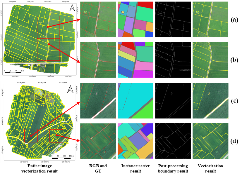 To further resolve issues of parcel adhesion or unclosed boundaries, boundary refinement is applied through post-processing algorithms, thereby obtaining complete and closed vector parcel data. Compared with raster results, the vectorized results are smoother and more regular, effectively reducing over-segmentation and under-segmentation problems caused by blurred or broken parcel boundaries.